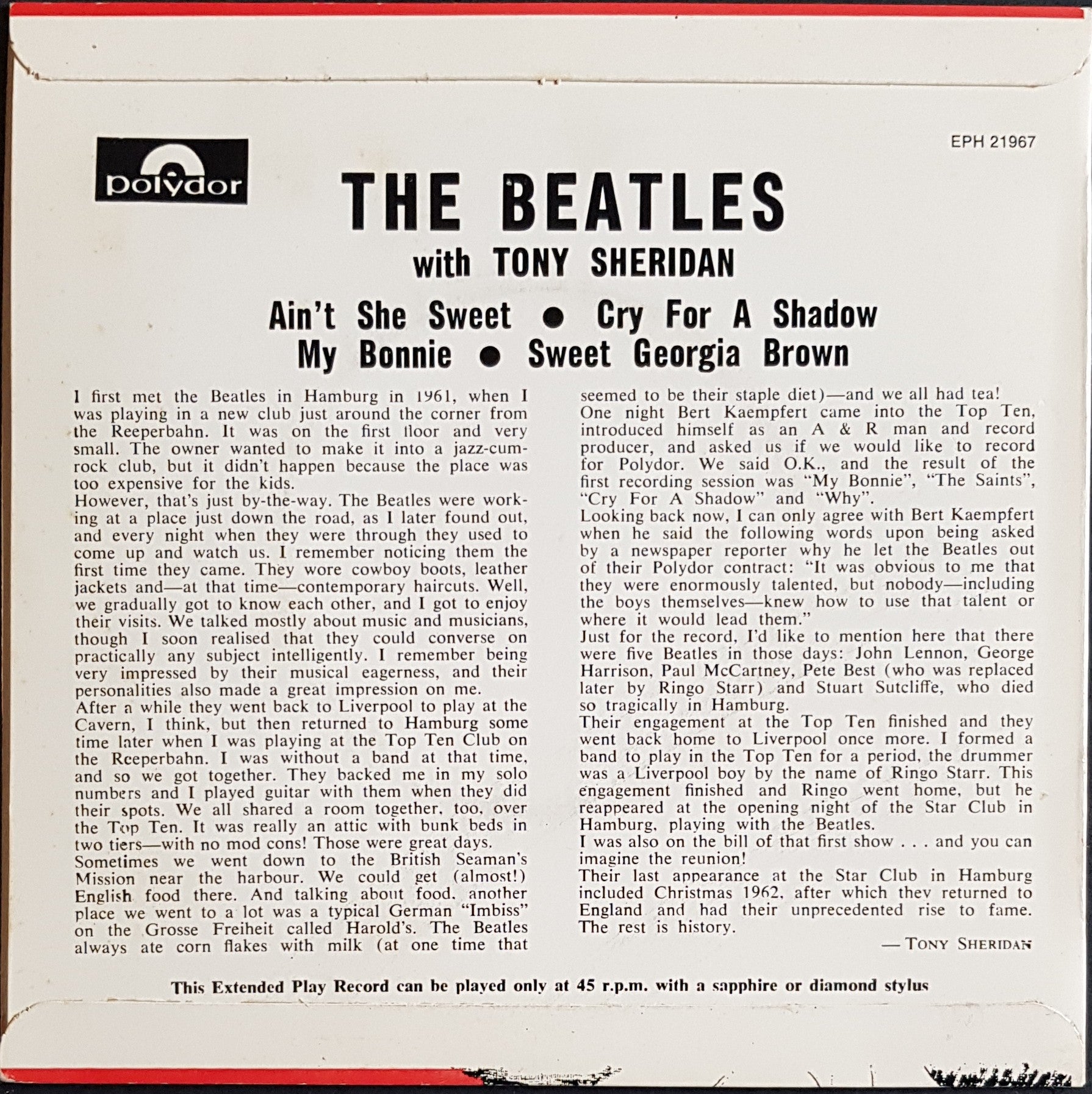EP PS. 1966 International Polydor Black Label EPH-21967. Minor Wear and Foxing on Cover.