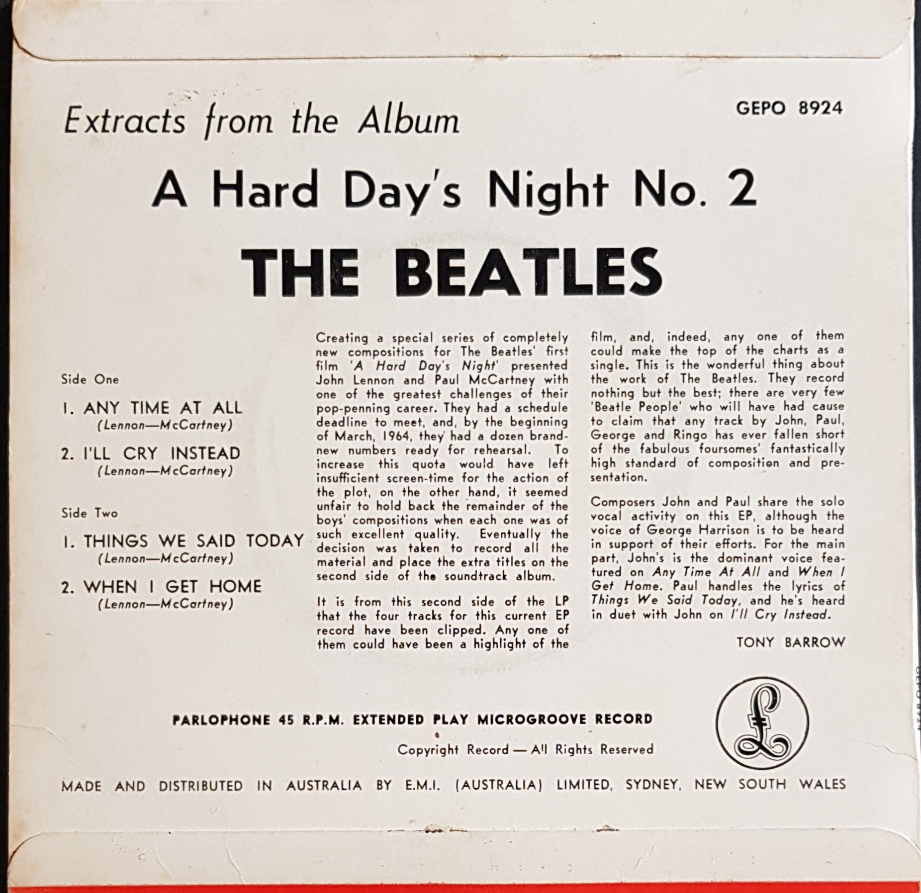 EP PS. 1965 Black & Yellow Label Parlophone GEPO 8924. Has Leeds Music Royalty Stamps on Labels. Minor wear and creases on cover. Light hairlines / scuffs on disc.