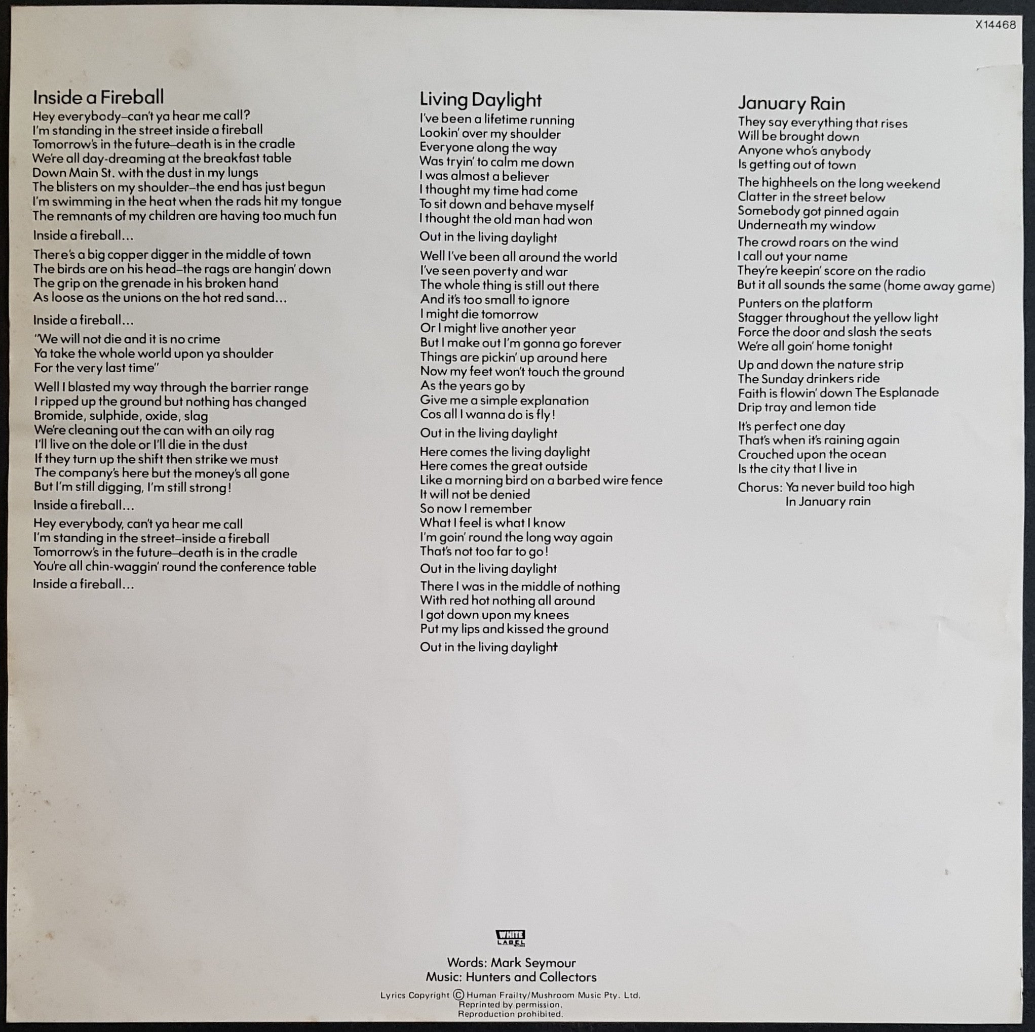 PS w.Insert (has small tear and foxing). 1987 White Label Records X-14468. Surface wear, light creases along spine and opening and red print along spine of cover has faded.