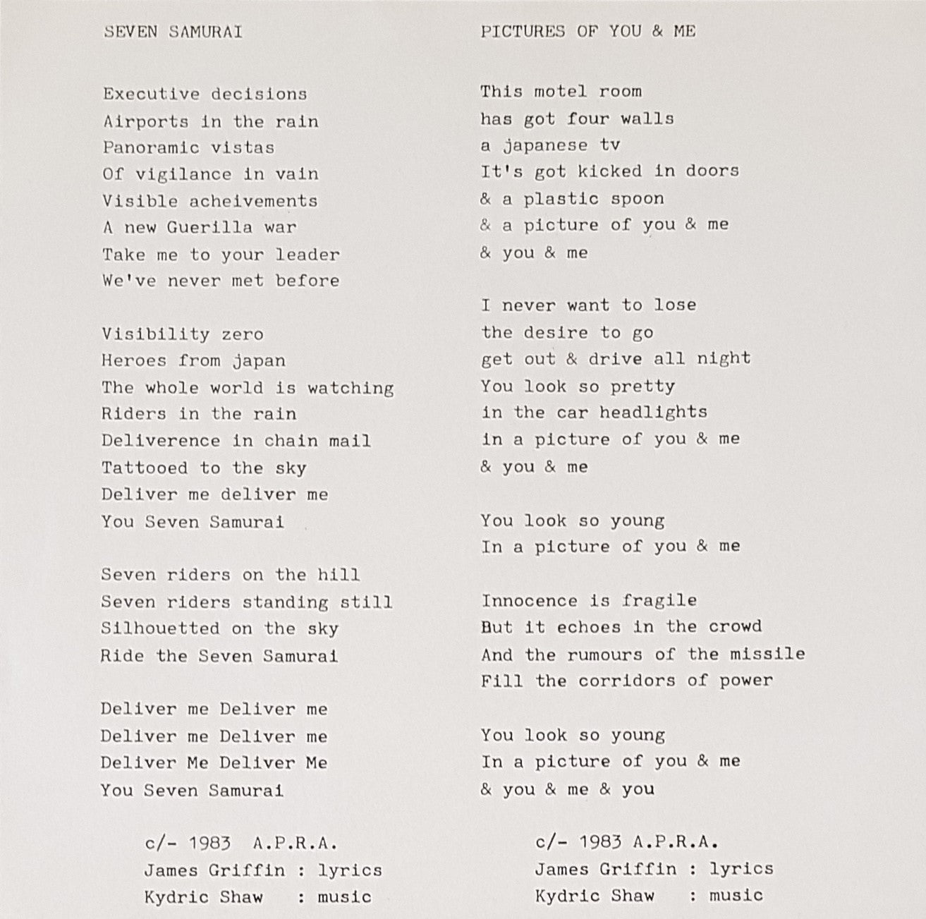 PS w.Insert. 1983 Venice Beach VB-001. Minor Creases and Wear on Cover. Top edge has thin fade line to print. Pressing marks / scuffs on both sides, do not effect play. Moody Organ Driven 80's Power pop w. James Griffin Vocals.