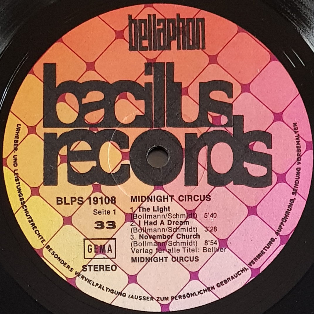 Gatefold Cover. 1972 Bacillus Records BLPS 19108. Laminated finish to cover has scuffing and wear. Small crease along top of spine has caused laminate to chip and fall off. Several light hairlines, scuffs and marks on disc. Plays with crackle and pops