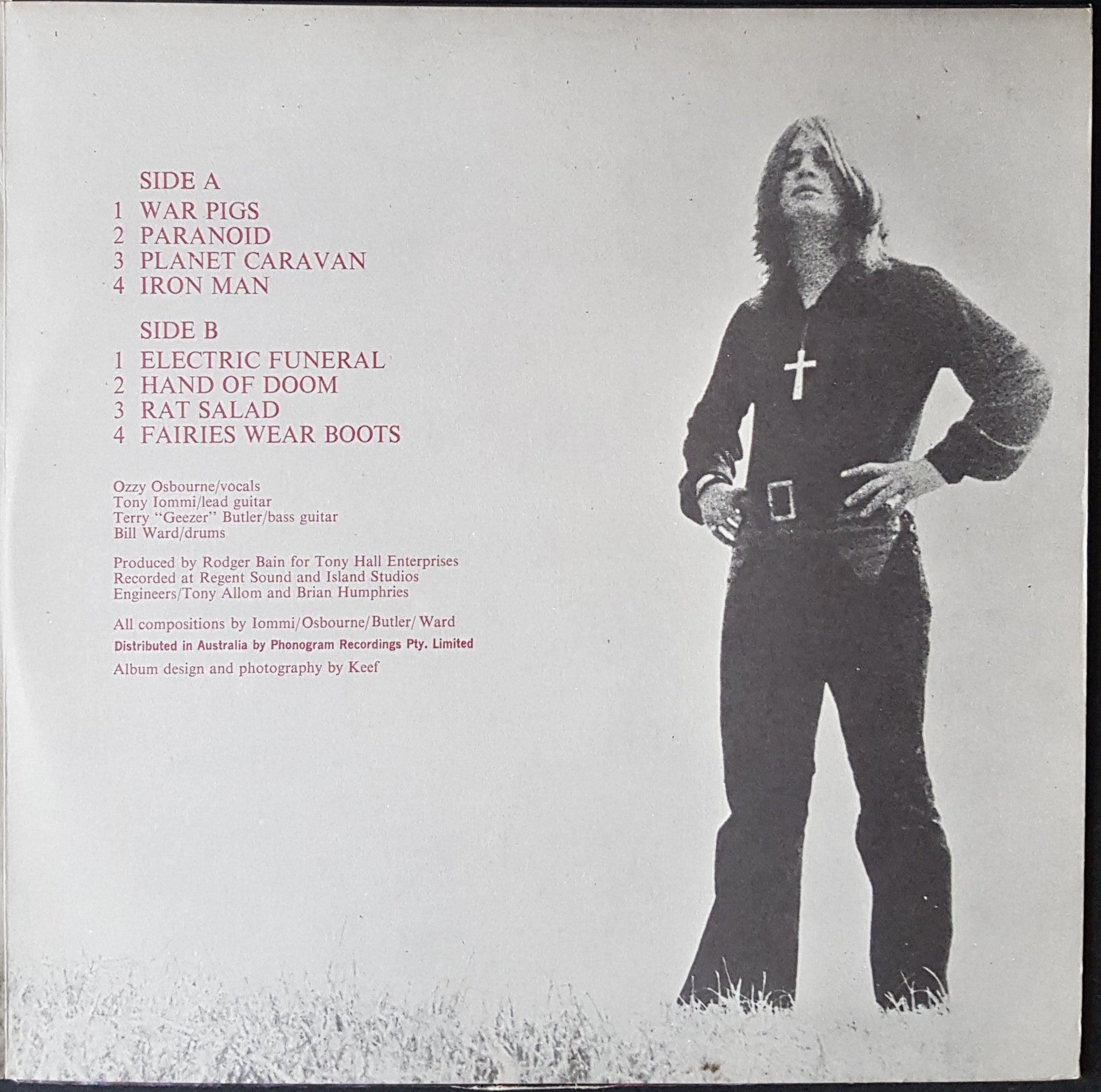Gatefold cover. 1972 Vertigo Swirl Label 6360 011. Minor edge wear and seam split on cover. Scuff across back end of Planet Caravan and start of Iron Man, otherwise clean.