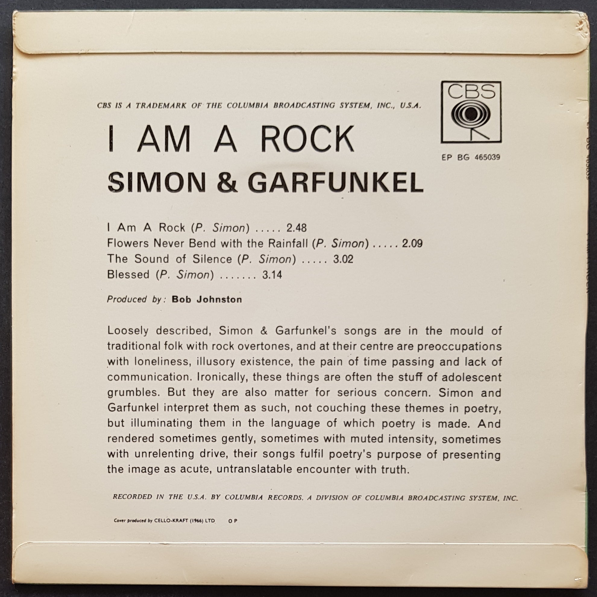EP PS. 1966 CBS BG 465039. Laminated cover has minor ring mark from label anti-skate ring. Top left hand corner of sleeve has minor damage. Disc is very clean.