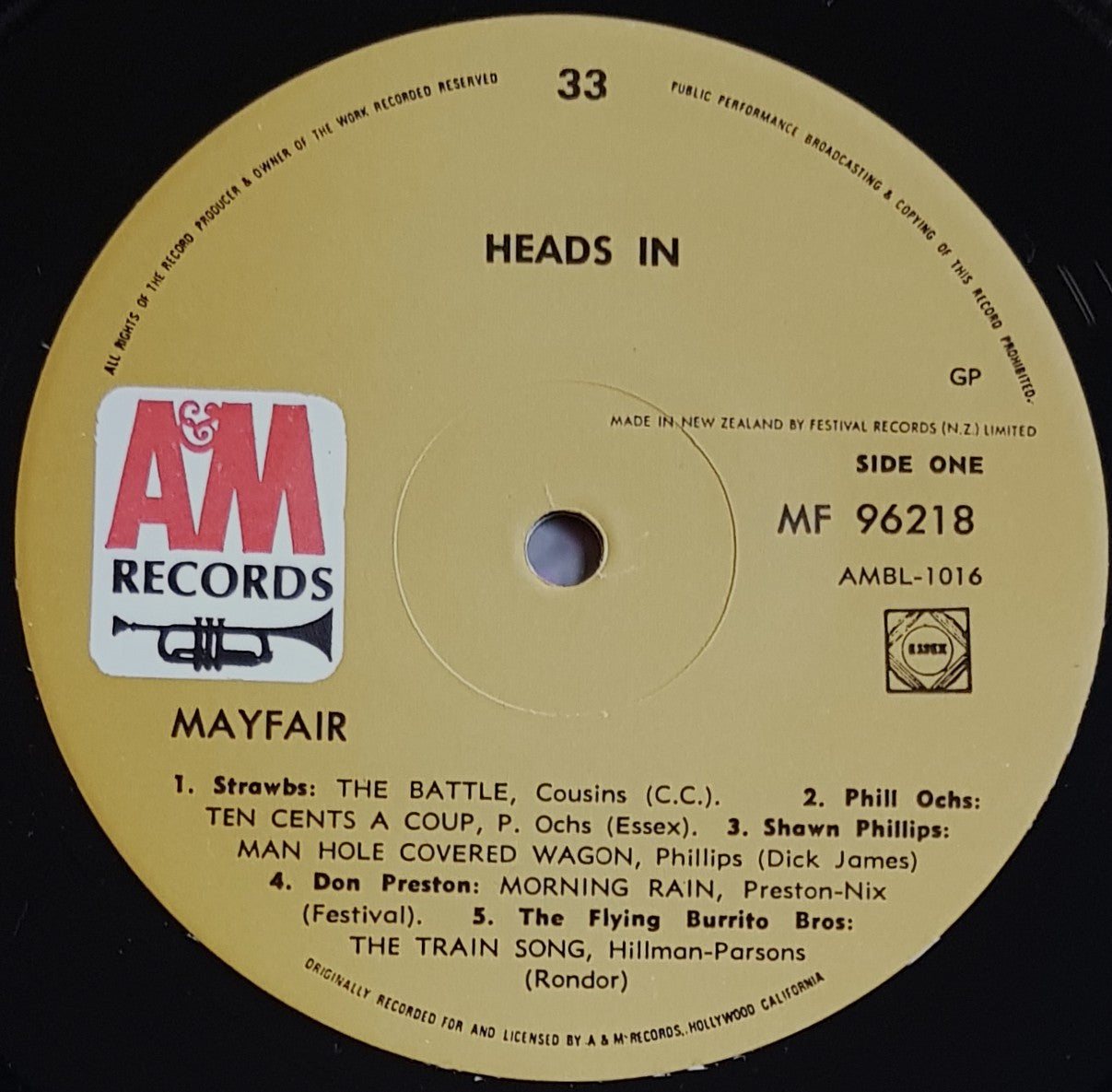 1970 A&M MF 96218. Ring wear, water stain and small spot of print removal along opening from water damage. The Flying Burrito Bros., Strawbs, Phil Ochs