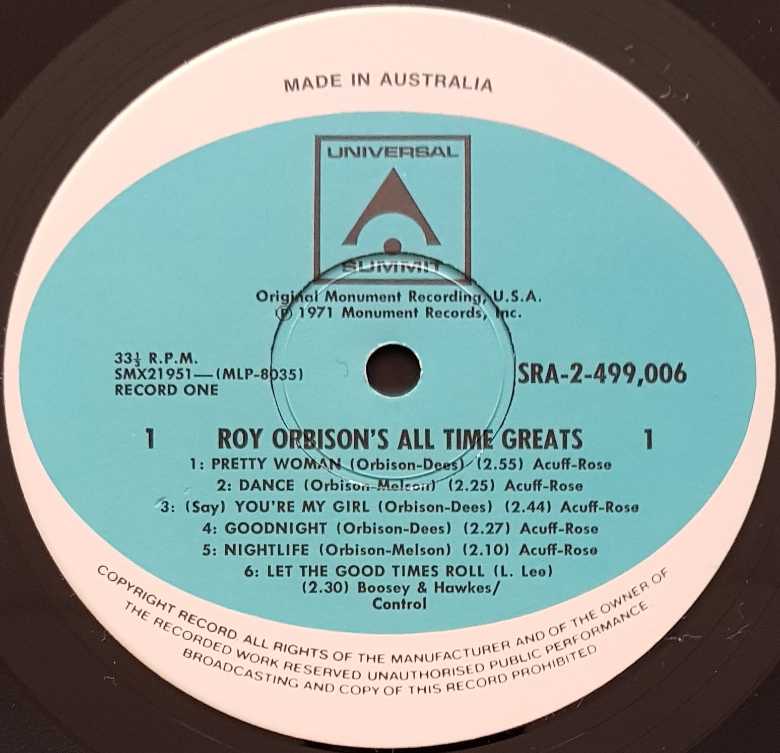 Single Cover. 1975 Universal Summit SRA2.499.006. Small mark on 'In Dreams' otherwise records are clean. Nice gloss finish to cover, with unfortunate corner crease