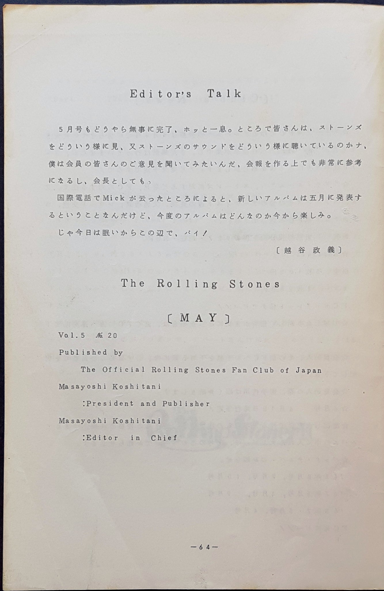 Rolling Stones Fan Club Of Japan Publication. Vol.5 No.20. 64 pages Late 60's Issue. Pics & Text On Stones & Info on New Releases.