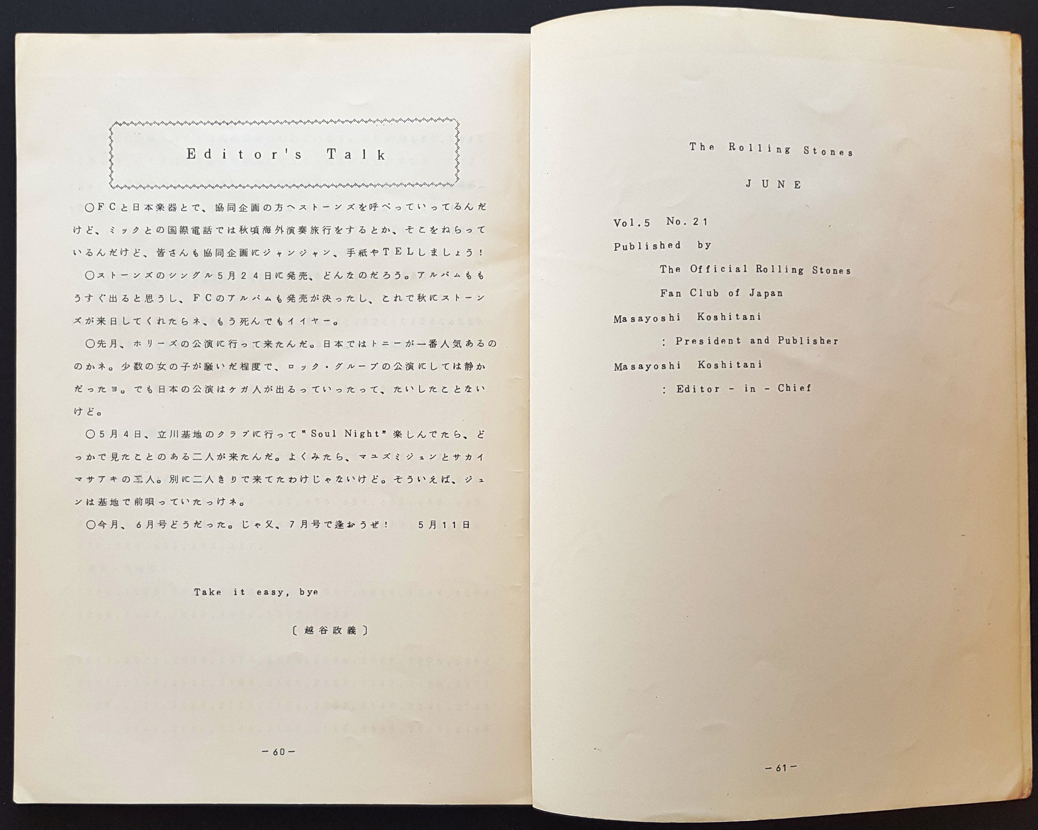 Rolling Stones Fan Club Of Japan Publication. Vol.5 No.21. 62 pages Late 60's Issue. Pics & Text On Stones & Info on New Releases.