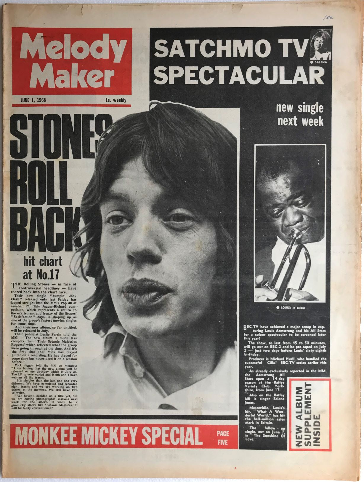 w.Jagger Cover + Article 'Stones Roll Back hit chart at no.17'. June 1, 1968