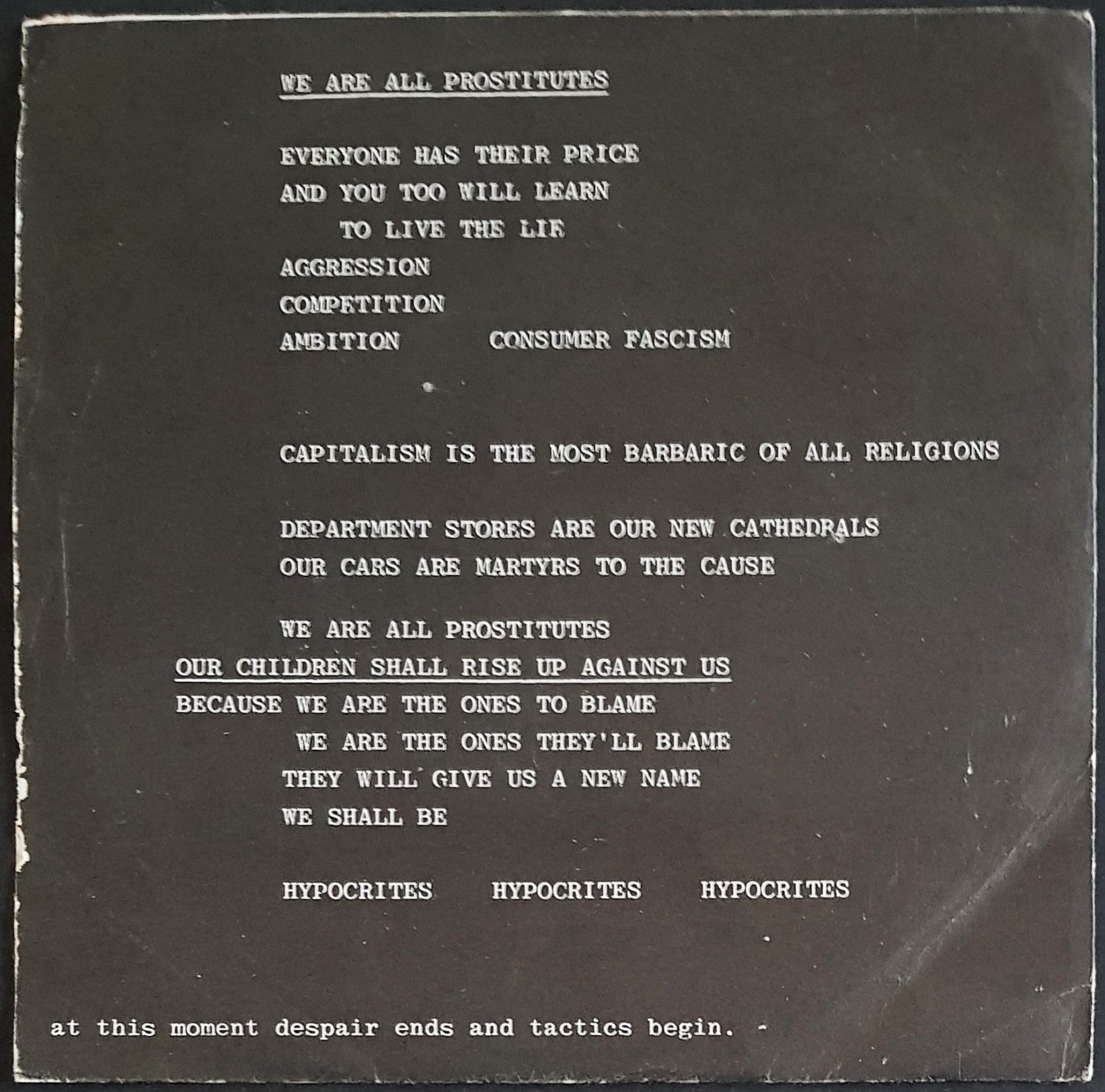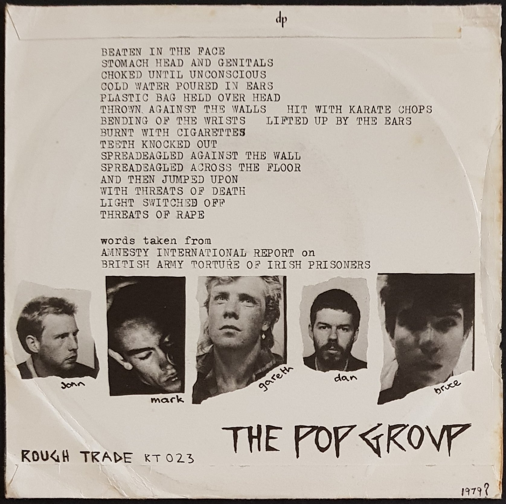 PS. 1979 Rough Trade RT 023. Sleeve has heavily creased corners, foxing on white side, silverfish damage along opening and small piece of flipback has been removed. Small mark at end of 'Amnesty' will sound. Otherwise clean disc. Minor foxing on labels.