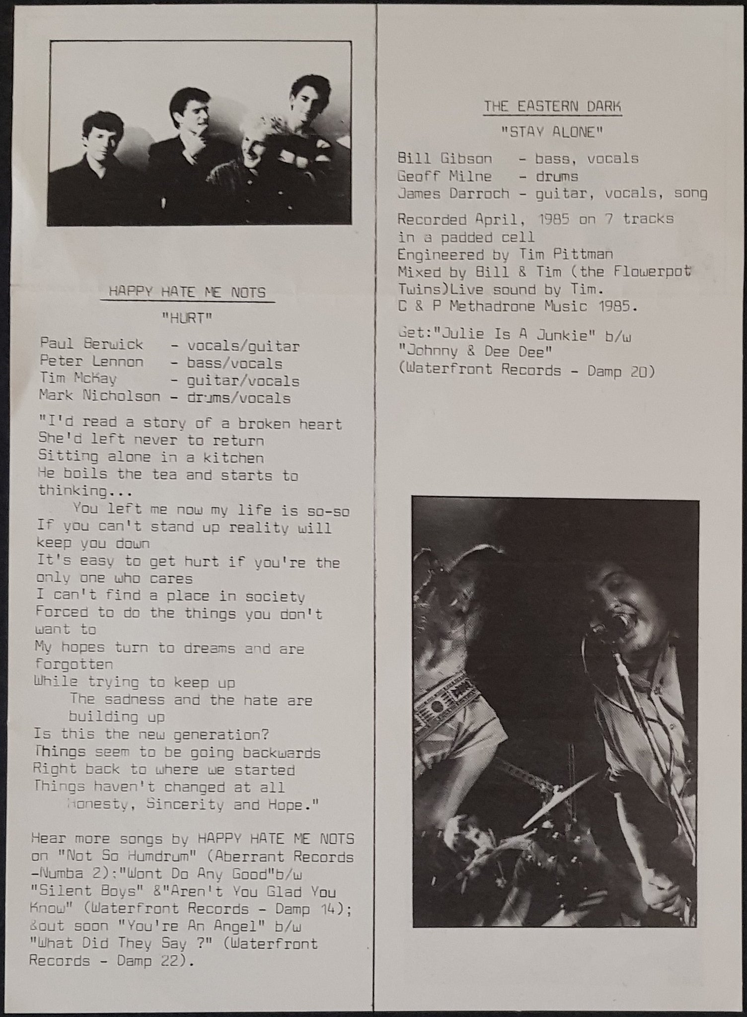 Promo Only EP w. Screen Printed Photographic Paper Insert Cover & Insert. 1985 Waterfront DAMP 21. Features Tracks By Eastern Dark, Itchy Rat, Tactics & Happy Hate Me Nots.