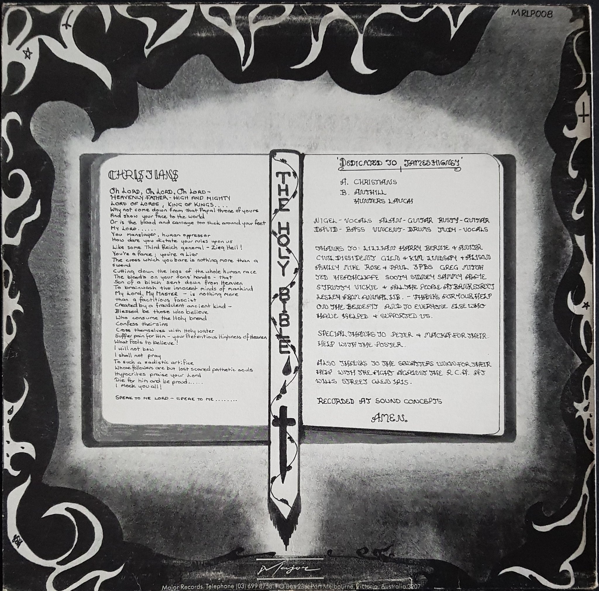PS. 1986 Major Records MRLP008. Ring, edge and surface wear on cover which has creases along spine and seam split. Tiny surface tear and tiny black marker spot on front.