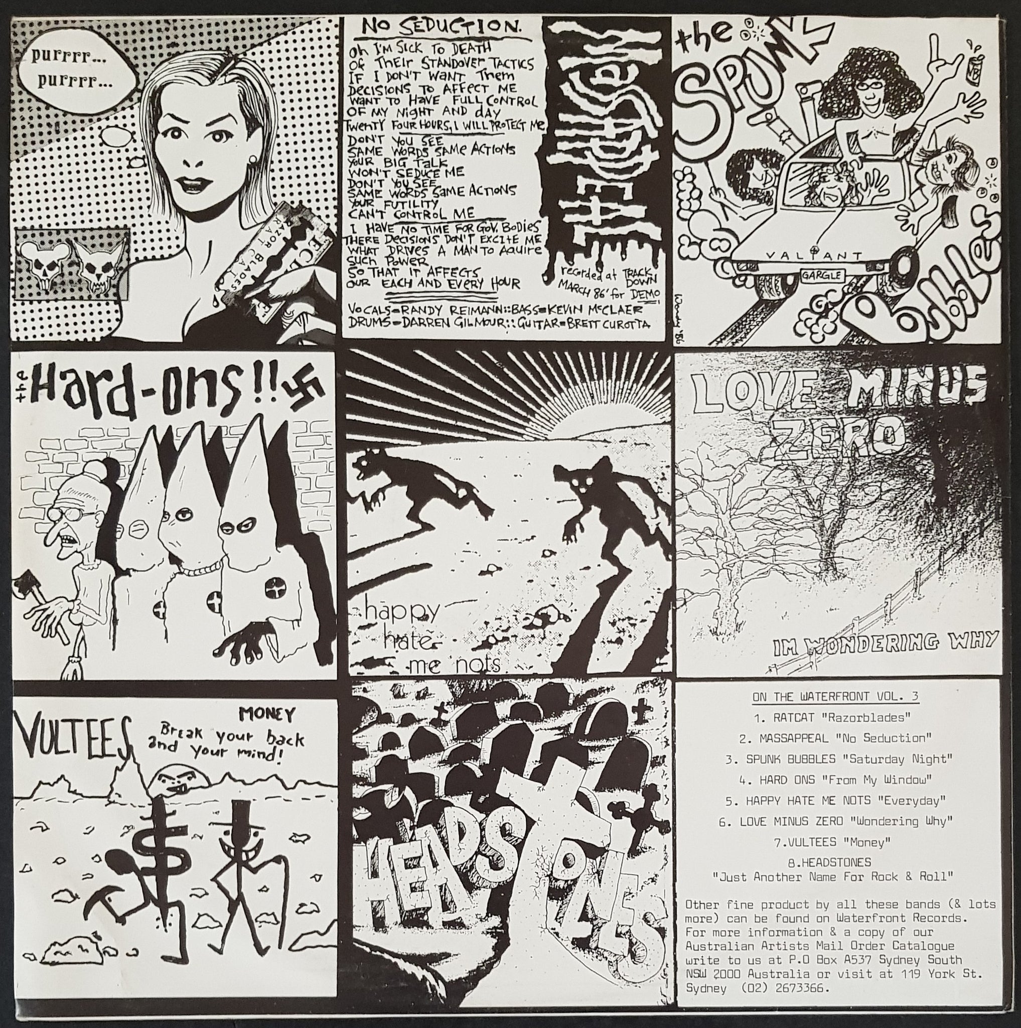 Compilation. 1986 Waterfront DAMP 43. Features Hard Ons, Ratcat, Massappeal, Spunk Bubbles, Headstones +++. Minor ring wear and water stain on cover.