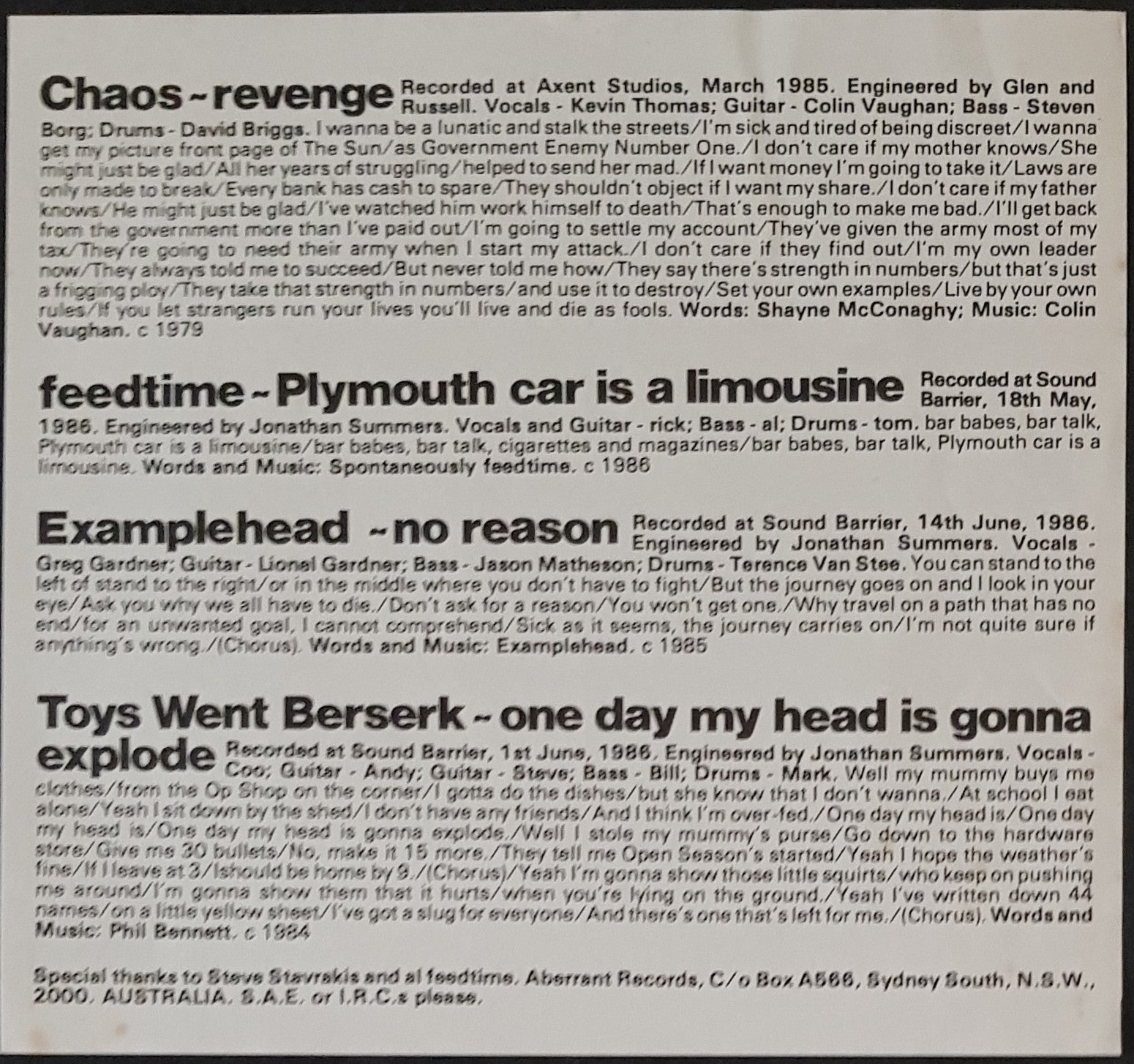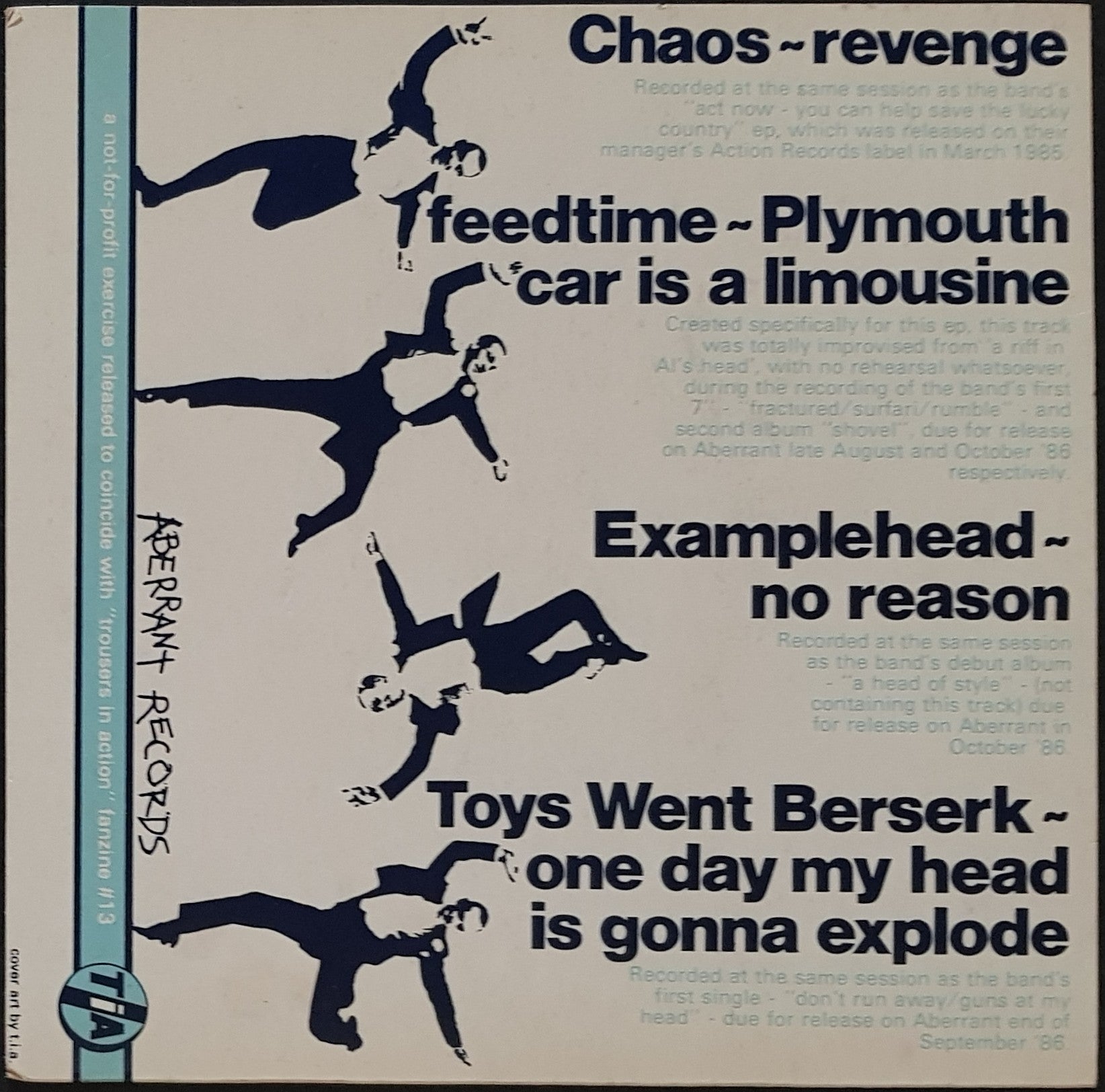 EP PS w. Insert. 1986 Aberrant Records ACT13. Also features Feedtime, Chaos, Examplehead and Toys Went Berserk. Minor foxing and surface tear on cover