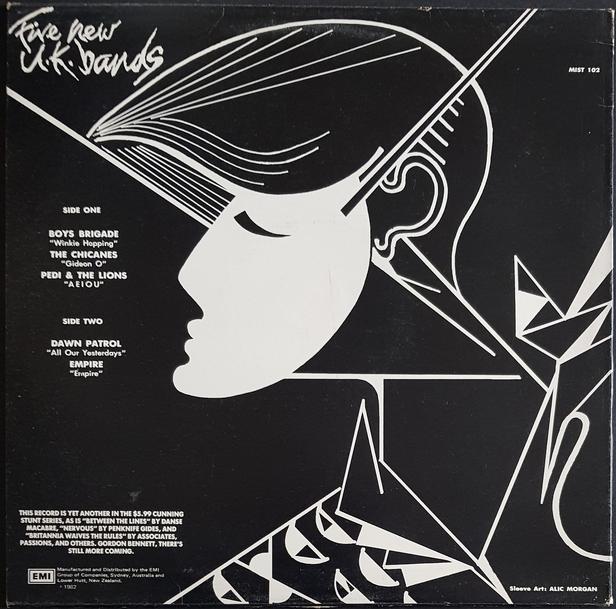 EP PS. 1982 Stunn MIST 102. Cover has corner wear and light creases along spine and bottom seam, minor ring wear and small split on bottom seam. Very Clean Copy. Record has minor warp, plays OK. Features Tracks By The Chicanes, Dawn Patrol, Empire, Boys Brigade & Pedi and the Lions.