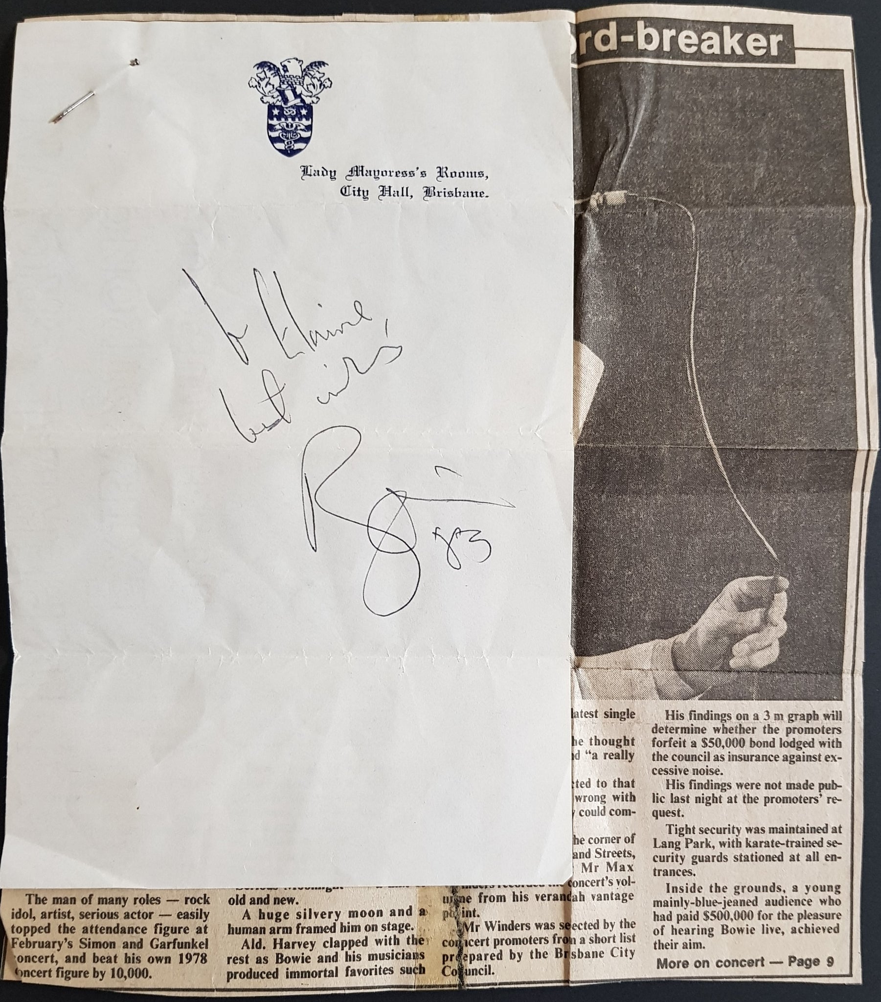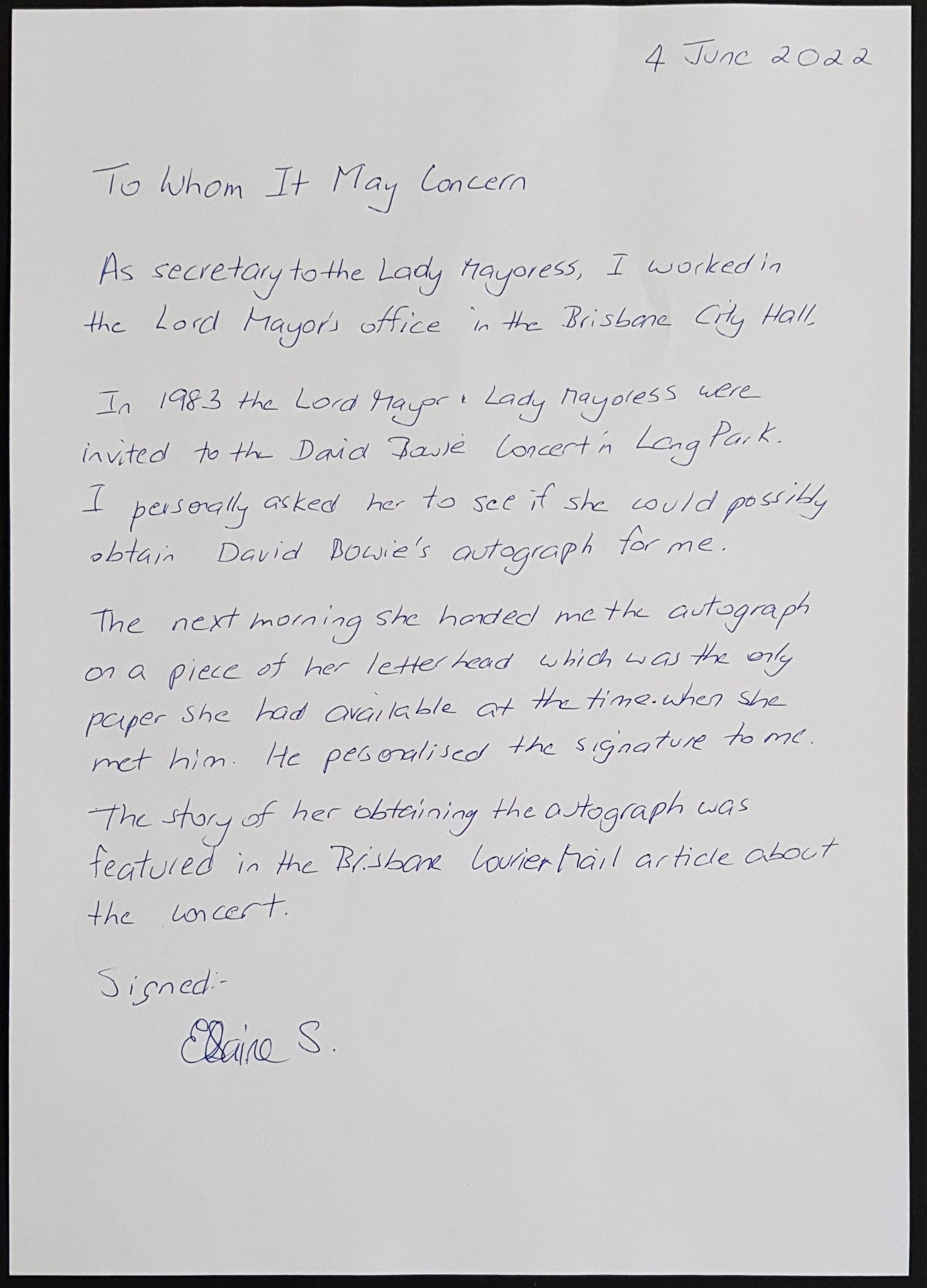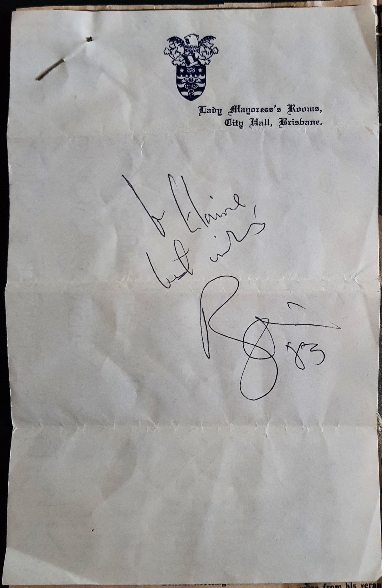 Autograph for Elaine, Obtained by The Then Lady Mayoress of Brisbane on Her Letterhead for Her Secretary. Comes with original article from Brisbane Newspaper recounting the story & the original owners handwritten account of events, C.O.A if you like.