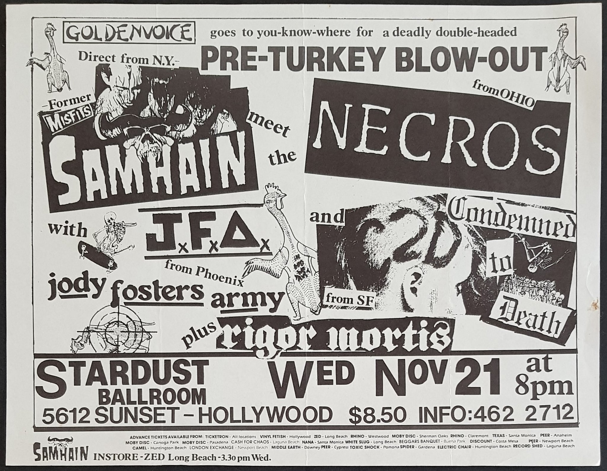 A4 Size. For Wed. Nov. 21 Show at The Stardust Ballroom on Sunset in Hollywood. Shard Bill with Necros, Jody Fosters Army, Rigor Mortis & Condemned to Death.