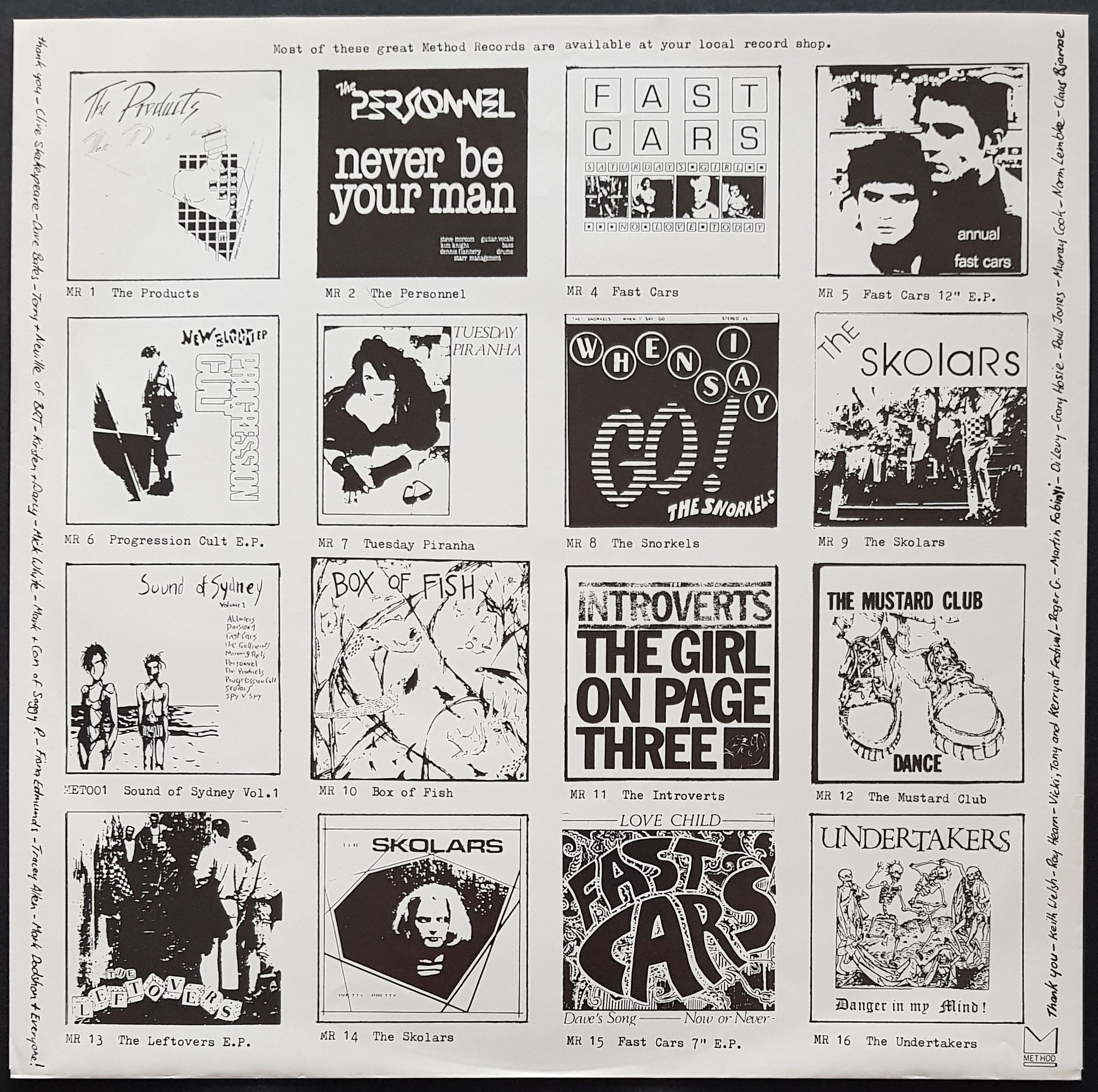 White Label Test Pressing w. Cover & Inner. 1984 METHOD L38263 Records Compilation with Snorkels, Leftovers, Johnnys, Hoi Polloi, Jaguars, Soggy Porridge etal. Record is unplayed, but has a heavy scratch on the first 2 tracks on Side 1. Minor wear on cover