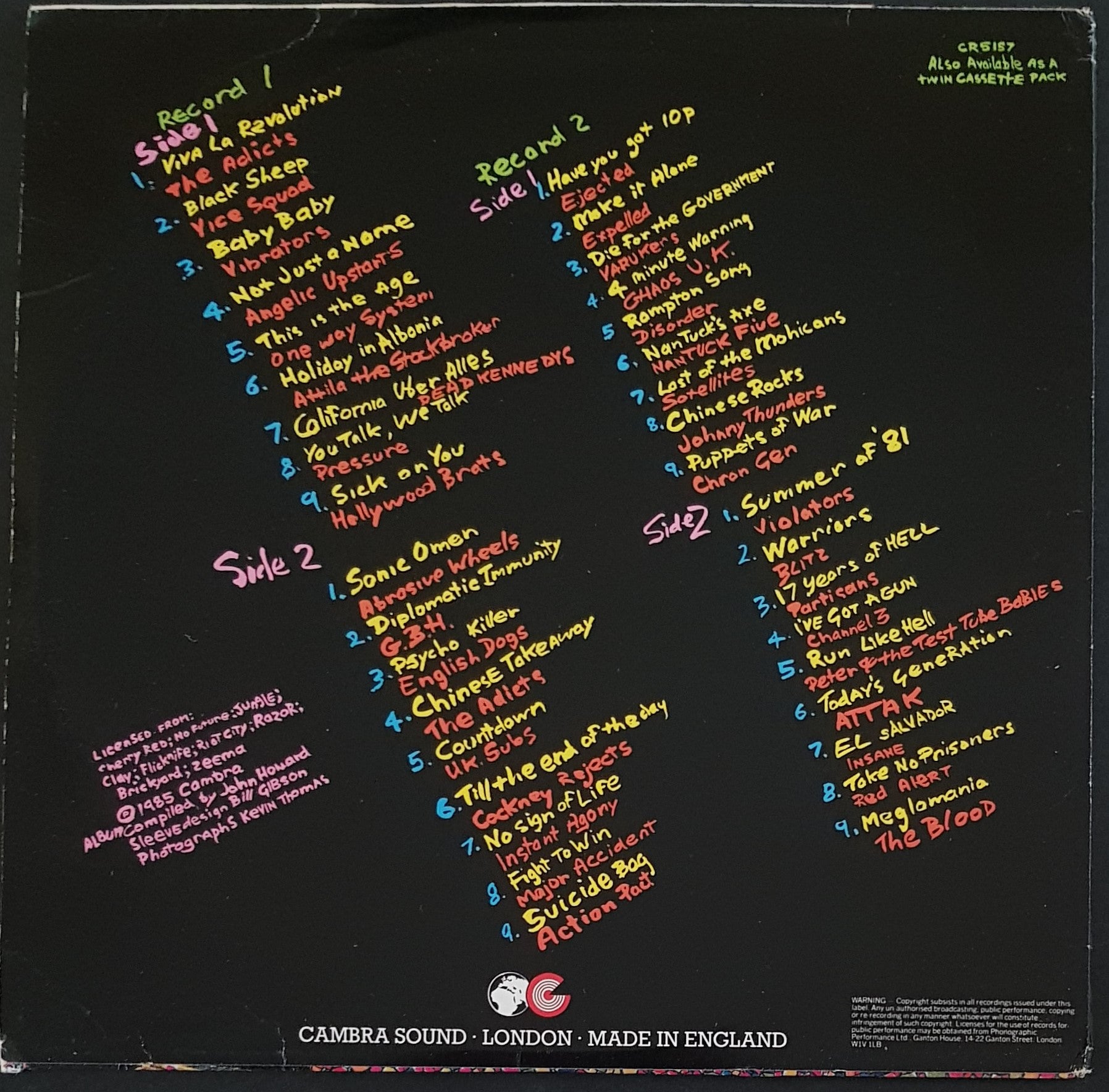 Compilation. 1985 Cambra CR 5157. 2 creased corners, light creases along spine, slightly dinged corners with one small split at opening. The Adicts, Vibrators, Vice Squad, Angelic Upstarts, One Way System, G.B.H., Cockney Rejects +++