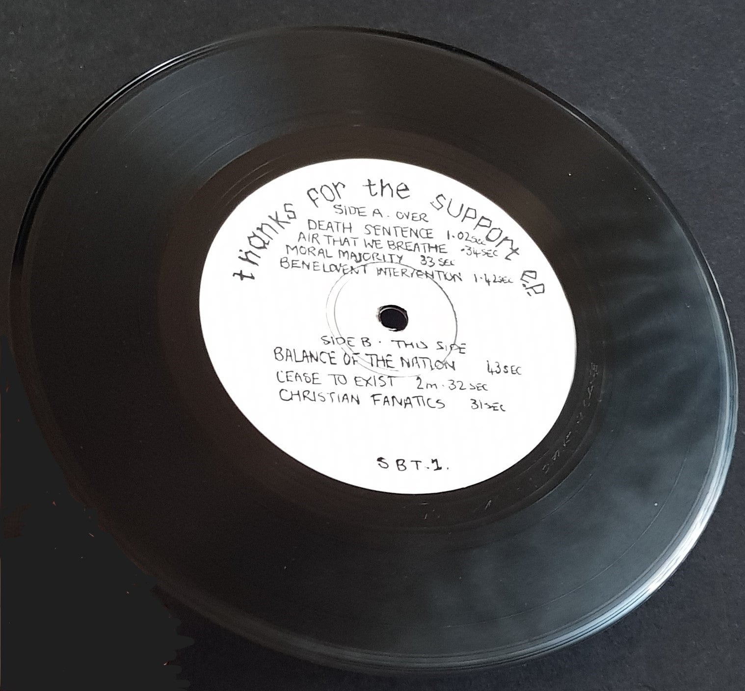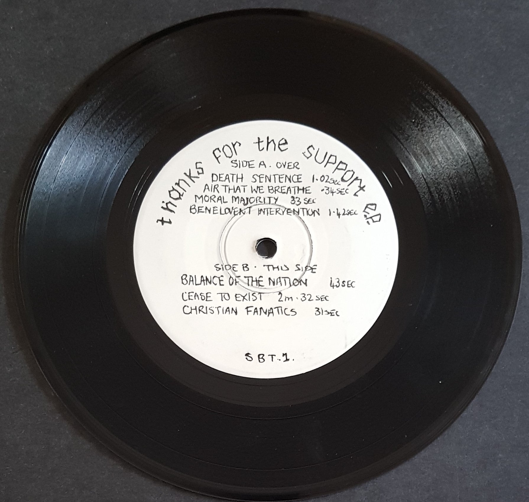 EP w. Black & White Poster Sleeve. 1985 Single Bullet Theory Enterprises SBT-1. Water stain on cover. No Insert. Heavy haze effect on disc, plays with minor background noise in parts.