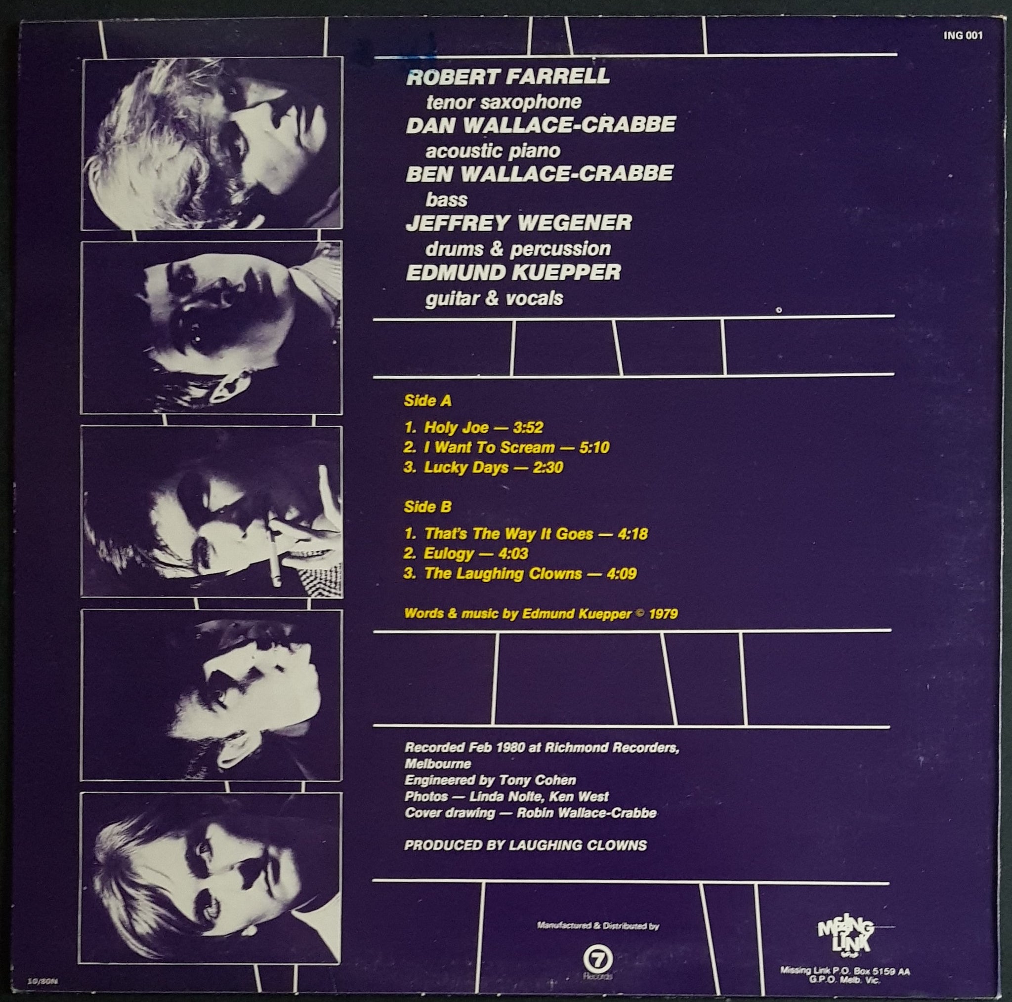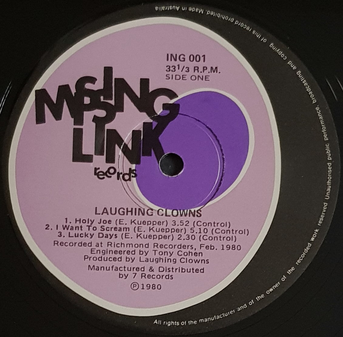6 Track Mini LP. 1980 Purple Missing Link Label ING 001. Cover has ring wear on front, tiny spots of water damage at opening and 2 small spots of surface removal of purple print. Back Cover has small Ink Stain.