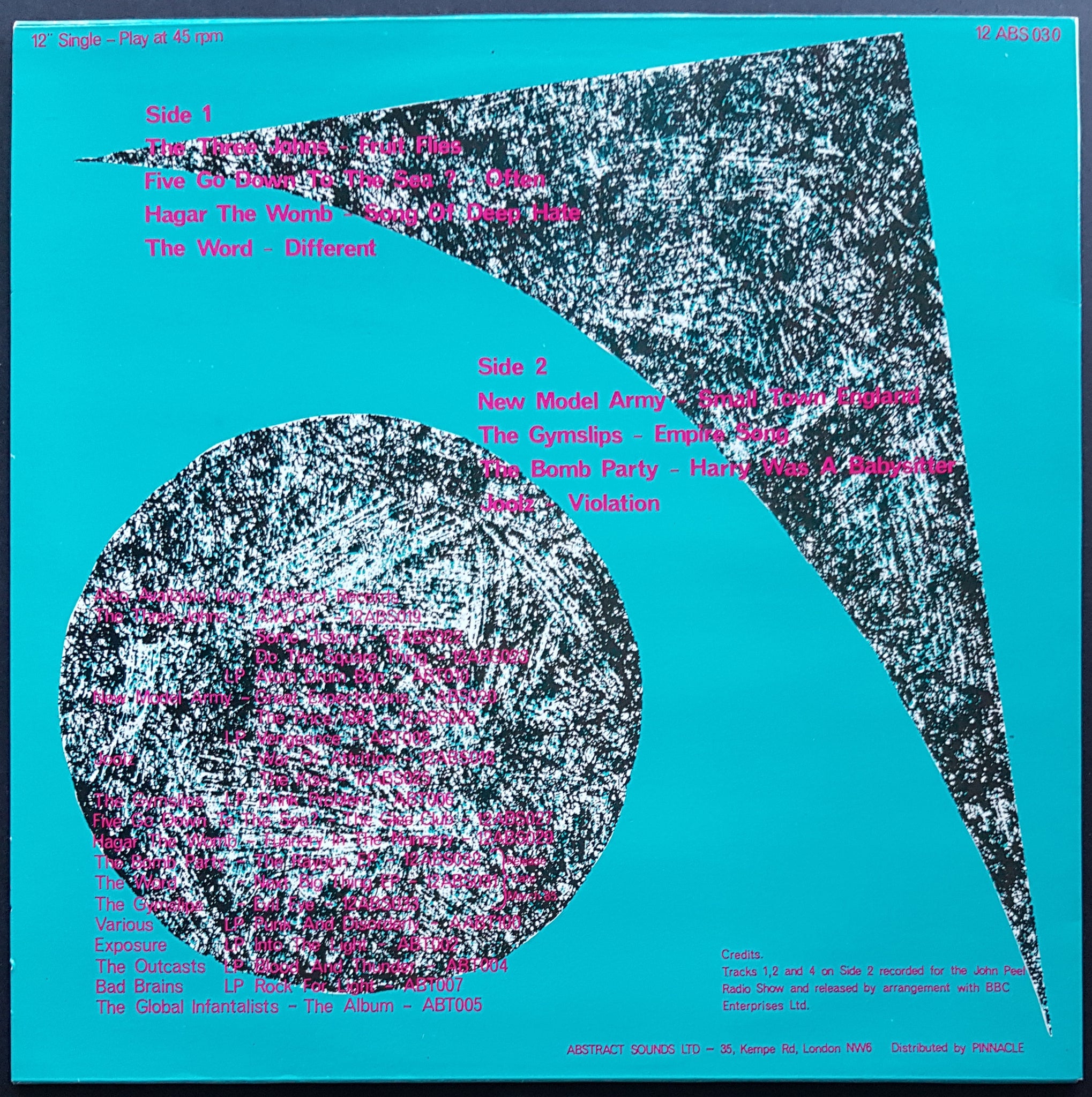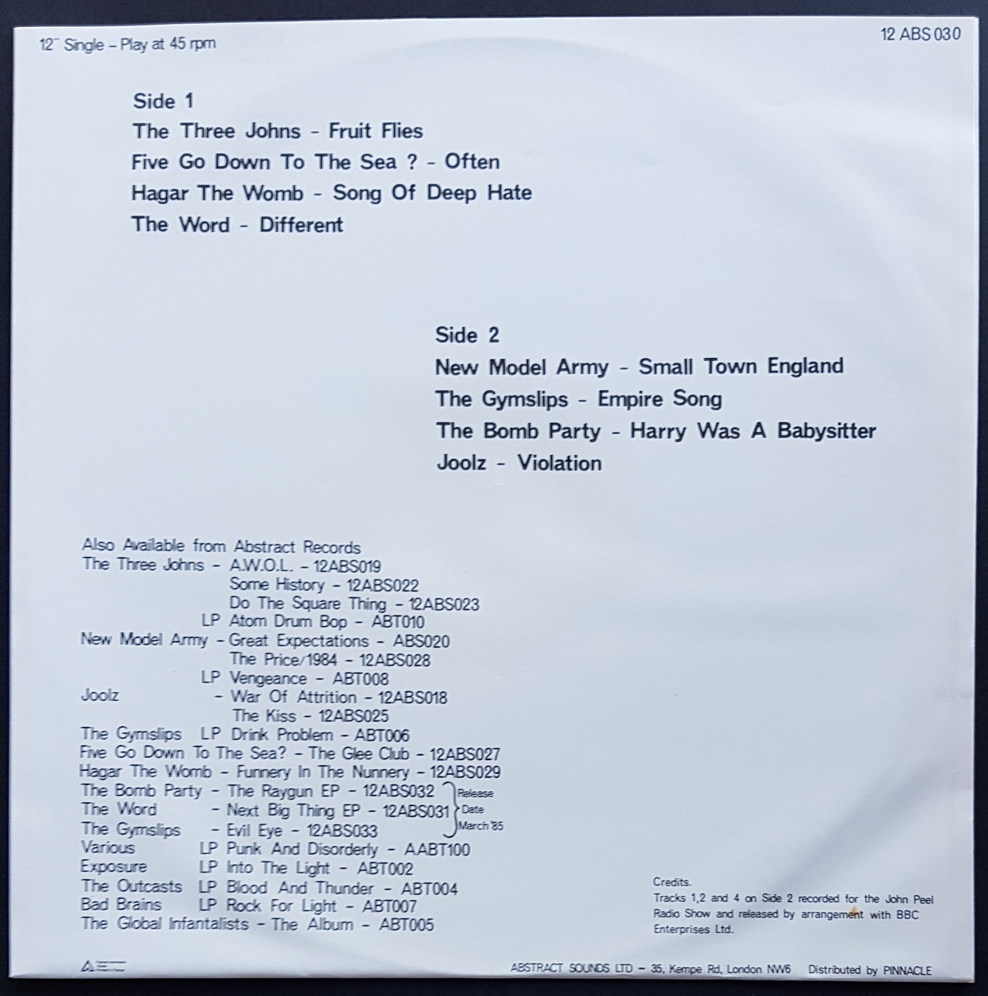 EP PS w.Inner. 1985 ABSTRACT Records 12 ABS-030. 8 Track Compilation. Features The Three Johns, Joolz & New Model Army