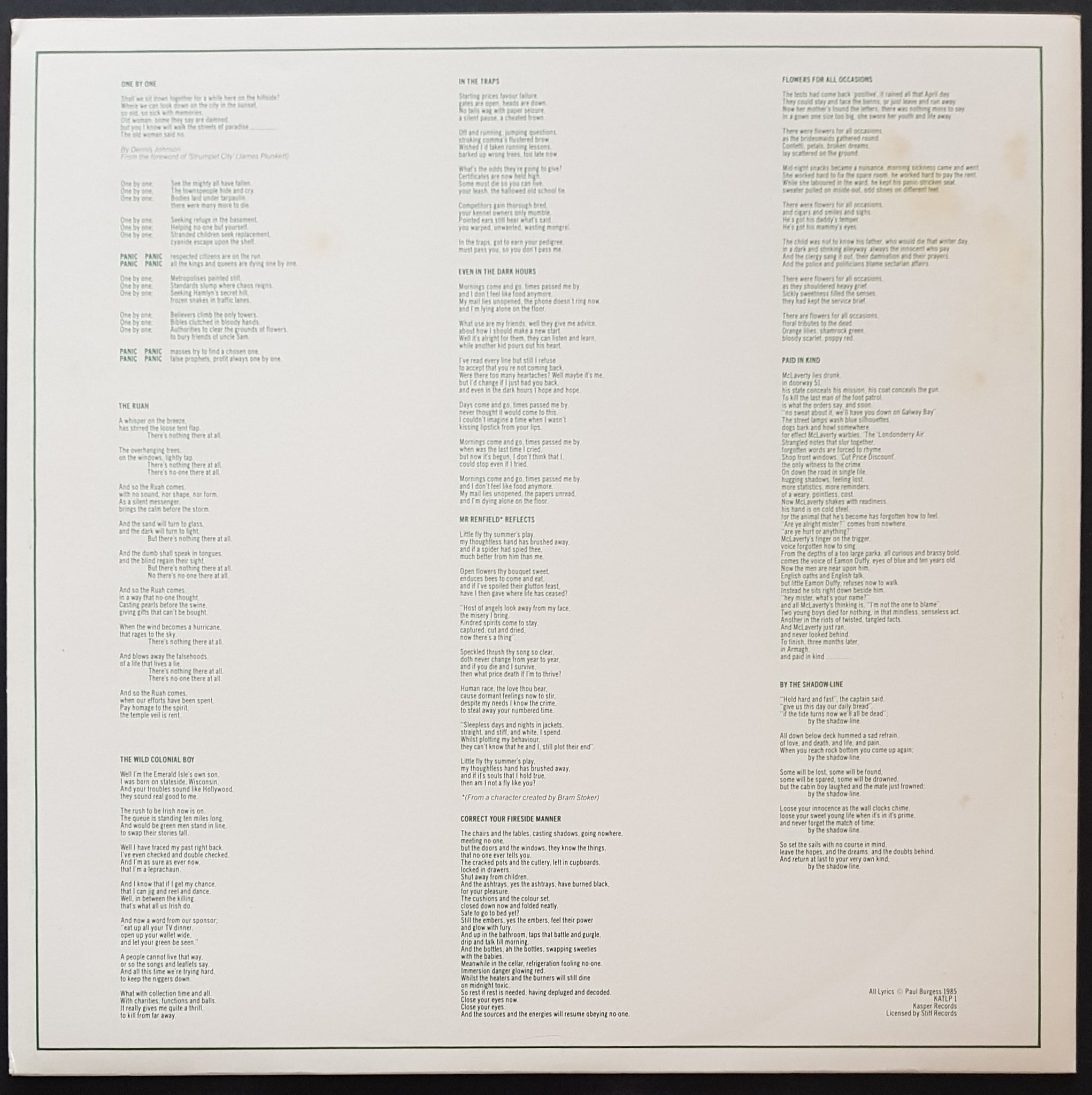w.Inner. 1985 Kasper Records KATLP 1. Minor Foxing on Inner