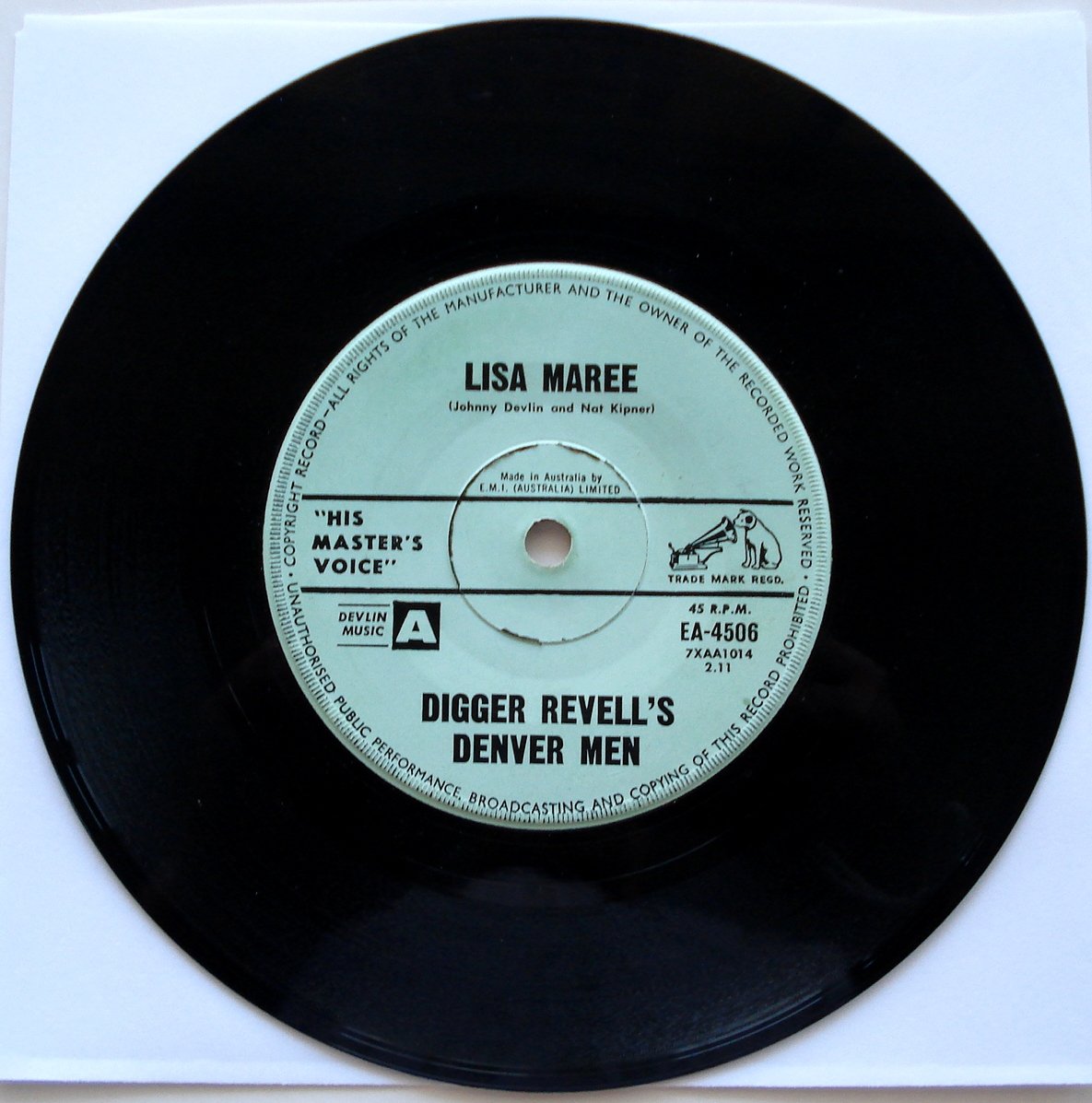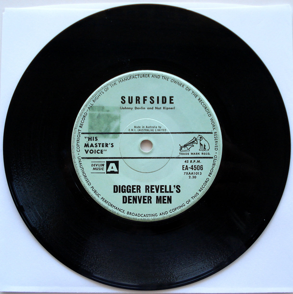 1962 Light Greeen HMV Label. EA-4506. A-side is slow instrumental, well played and has ocean sounds thrown in for good measure b/w quirkier B-side. Both sides penned by Devlin/Kipner. Small sticker stain on A-side label