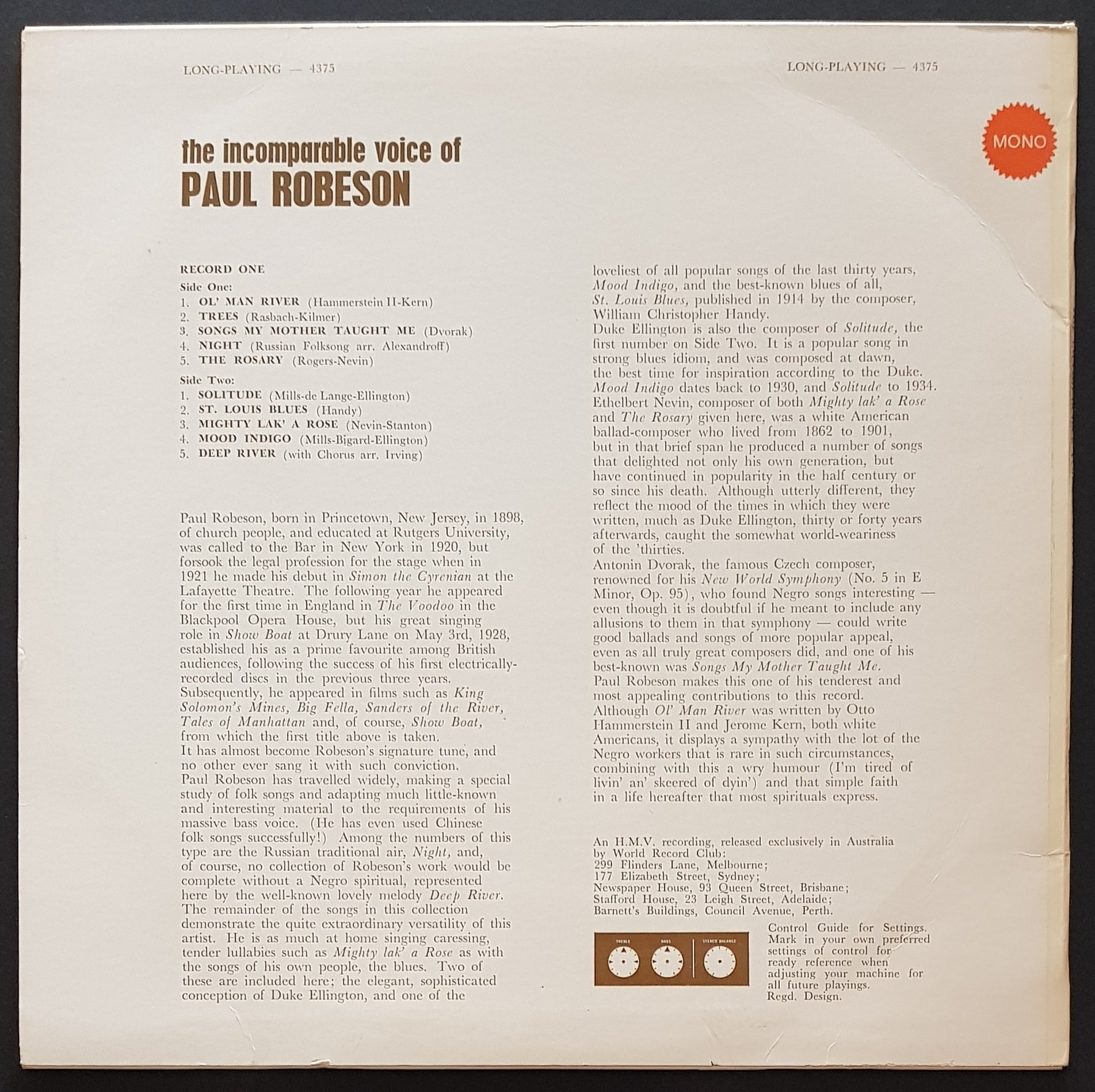 LP. 1968 World Record Club 4375. Mono. Laminated Front Cover has minor scuff marks. Back cover has minor wear and corner crease.