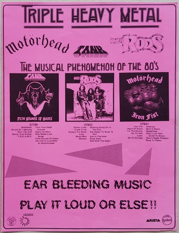 Poster for Original Release from Festival Records. 30cm x 38cm. Sold with 'Triple Heavy Metal' Double Sided Flyer from Festival featuring release info for Motorhead, Tank & The Rods.