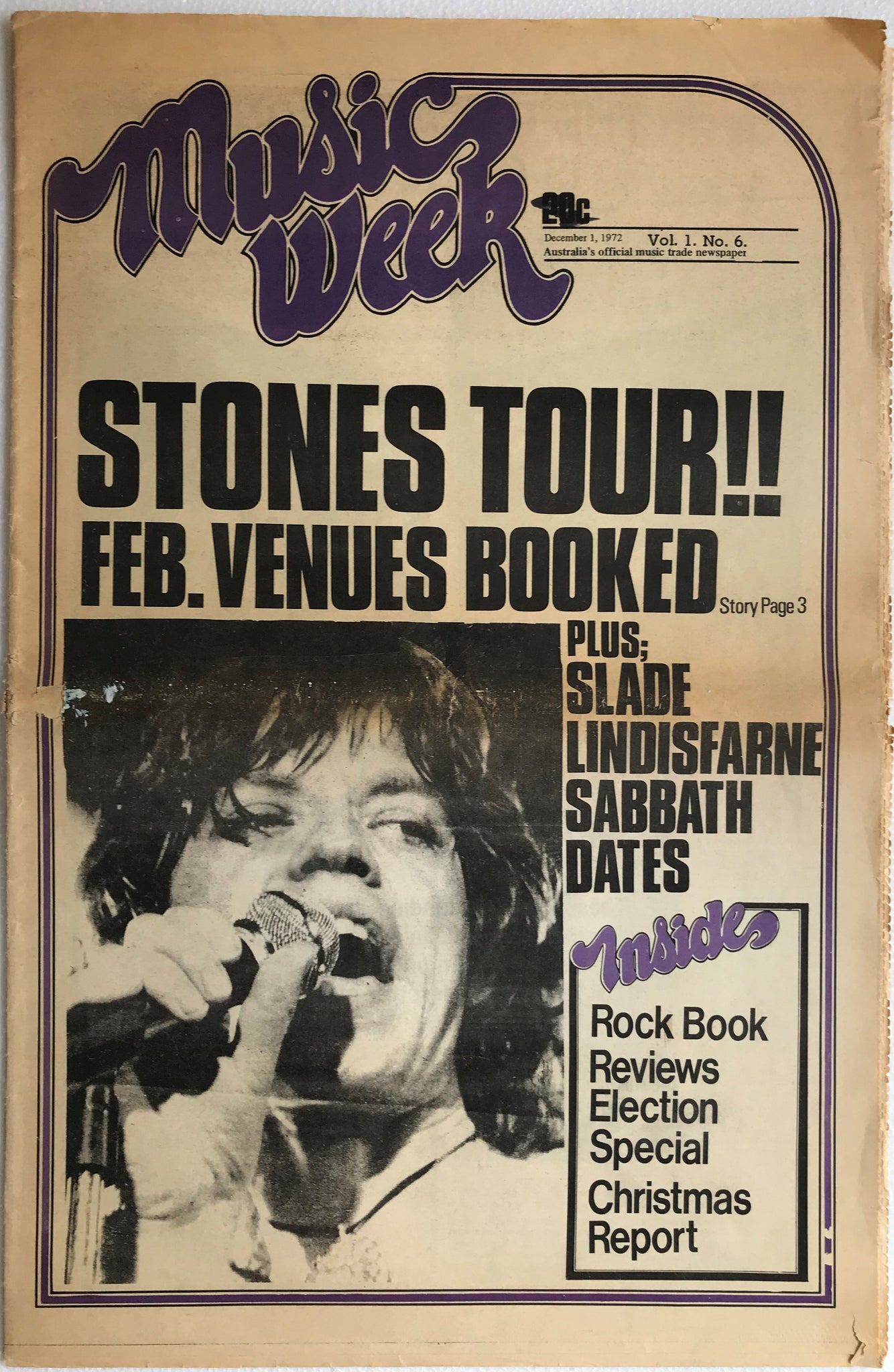 December 1, 1972 w. Mick Jagger Cover & Small article w.1973 Tour Dates. The rarest Aus music mag from that time. Previously folded in half, with tears on page ends, foxing and small piece of cover missing