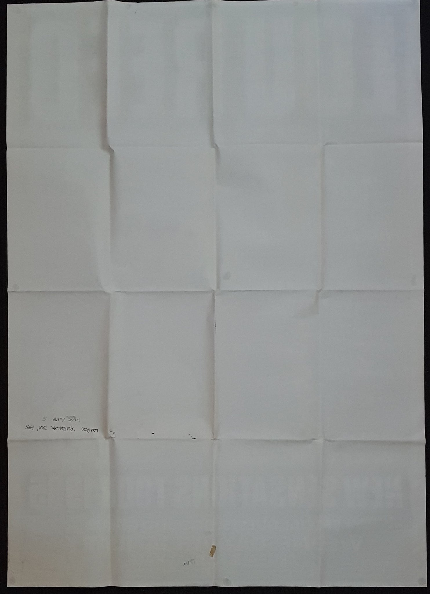 100cm x 140cm. John Foy design & print. Poster has small tear, blutak stains, writing on rear and has been folded in to 16, for close to 40 years. There is minor silverfish damage on 1 of the 16 panels. SHIPPED FOLDED.