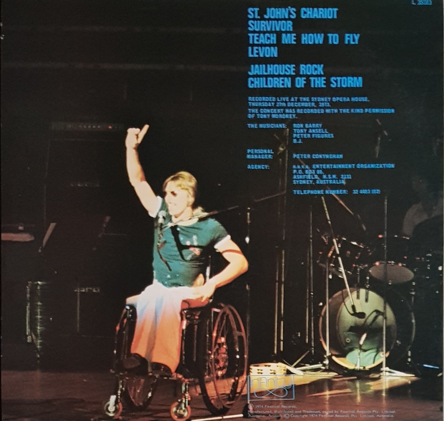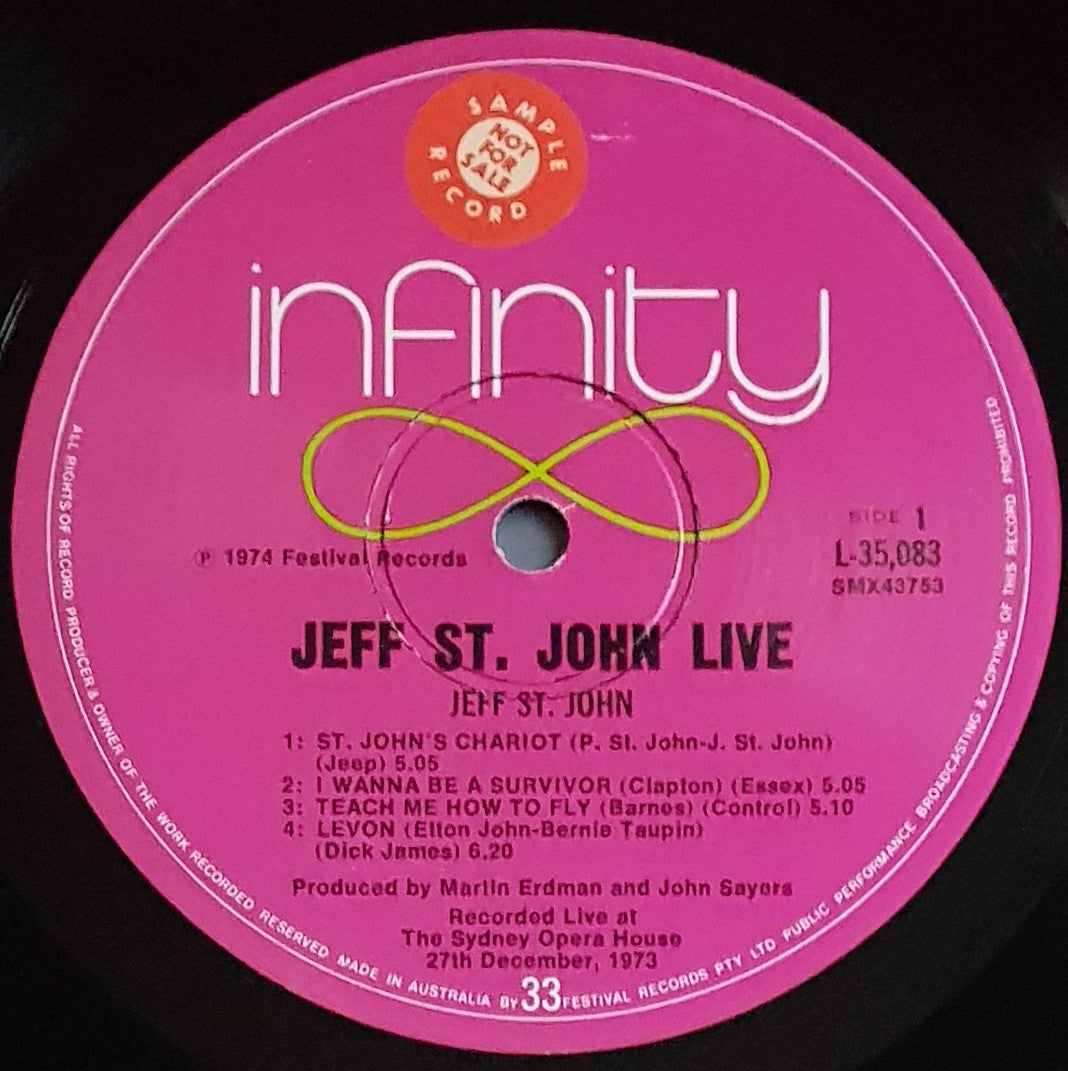 1974 Infinity Records L 35083. Recorded Live at the Sydney Opera House 27th December, 1973. Laminated cover has minor scuff / wear marks. Bottom right hand corner has small damage spot. Disc is very clean, EX if not better. Sample Record sticker on label