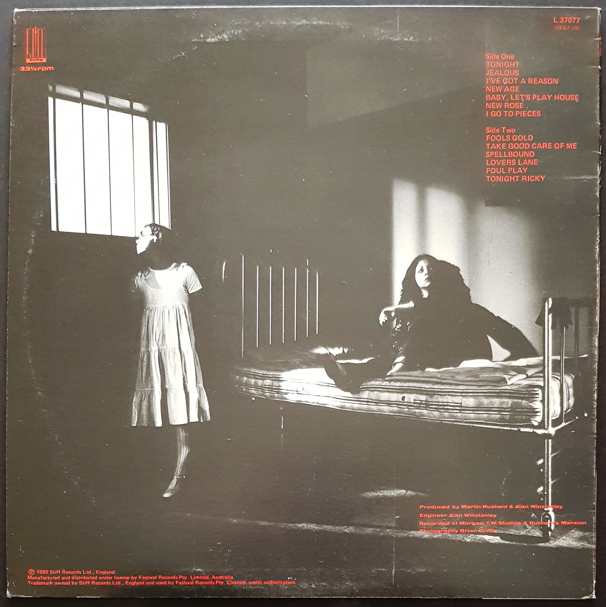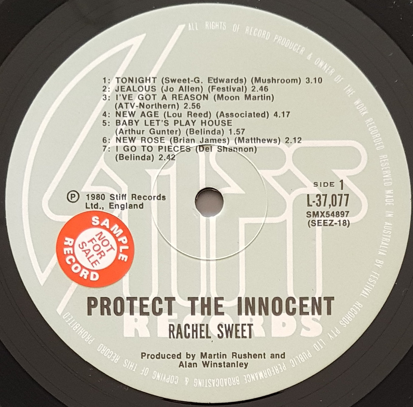 1980 Stiff Records L-37077. Sample sticker on label. Hype sticker on cover. Cover has minor ring wear and unfortunately a 3" x 1" reference sticker on the front.