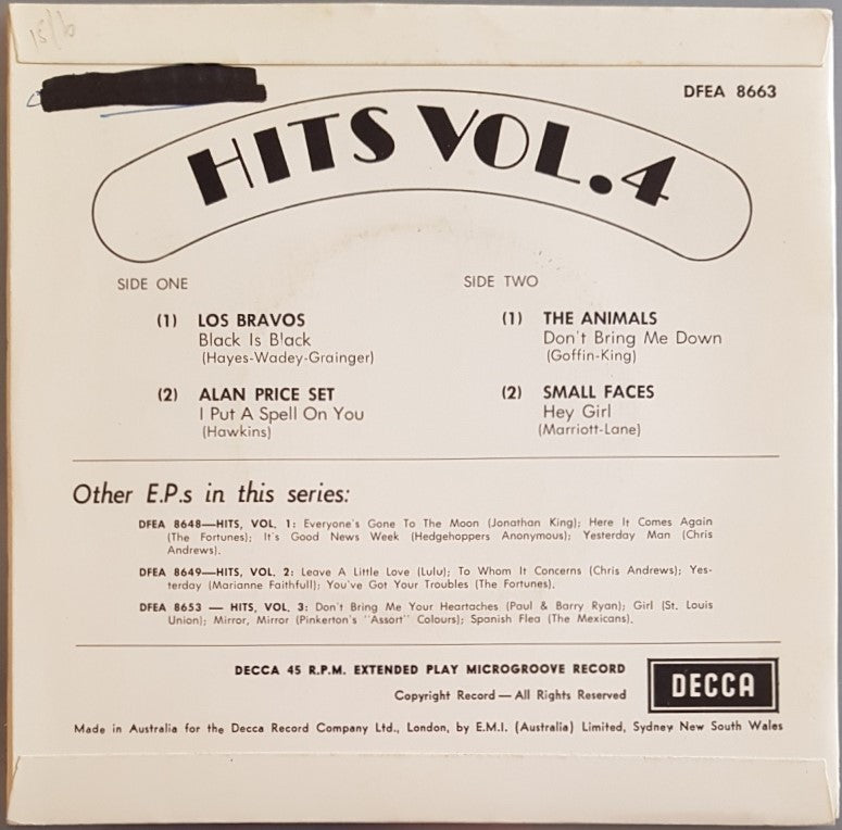EP PS. 1966 Original DECCA DFEA-8663. Various Artists Release with "Hey, Girl" Features The Animals, Alan Price Set & Los Bravos. Flipback Cover Has Minor Surface Wear. Small Writing on Back Cover Has Been Covered with Black Marker Pen