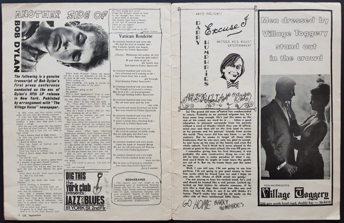 Issue No.22 September 1965. Articles or Advertisement for Barry Humphries, Bob Dylan & P.J.Proby. Cover has small writing, stains and spine is split 2/3 of the length.