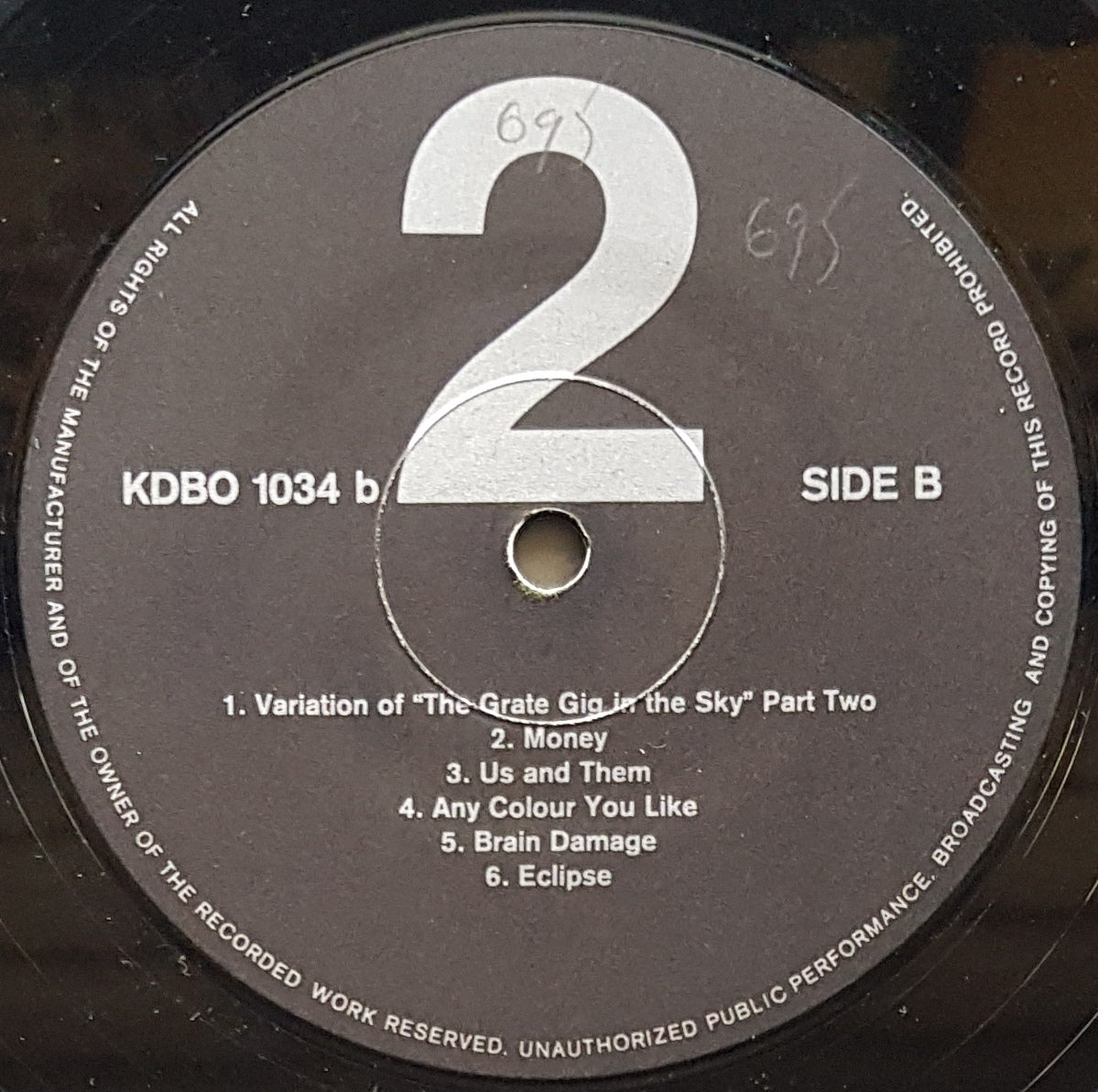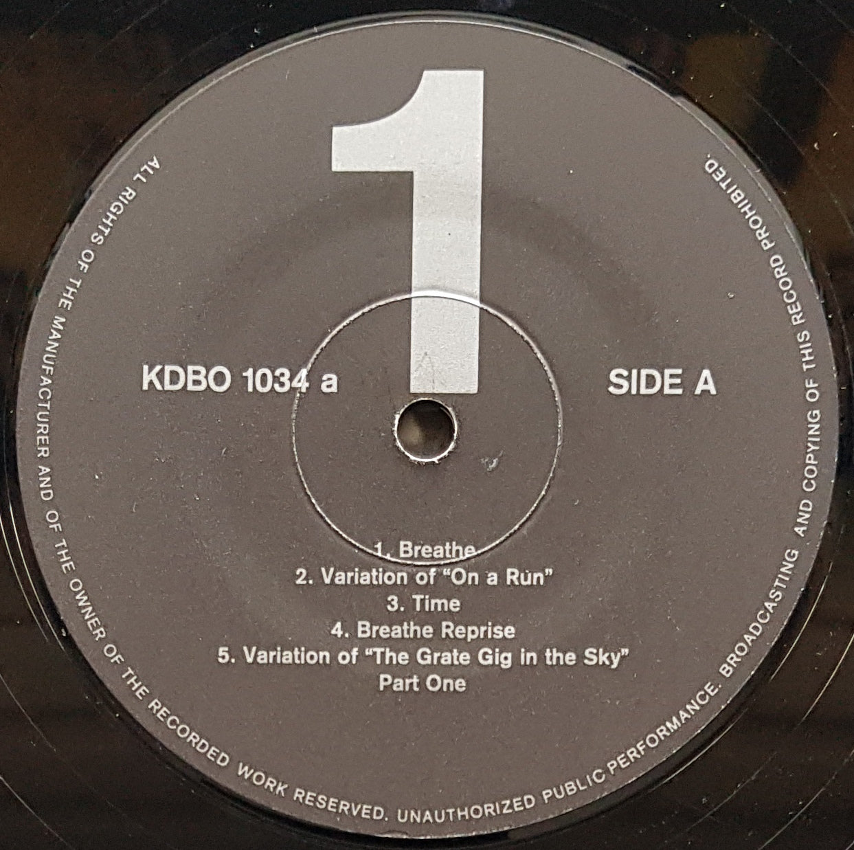 Deluxe Black & Silver Printed Cover. Black & Silver Labels. KDBO1034. Matrix 16 421/2. Small writing on label. Small mark on Breathe will sound. Cover has scratch on front and edge wear.