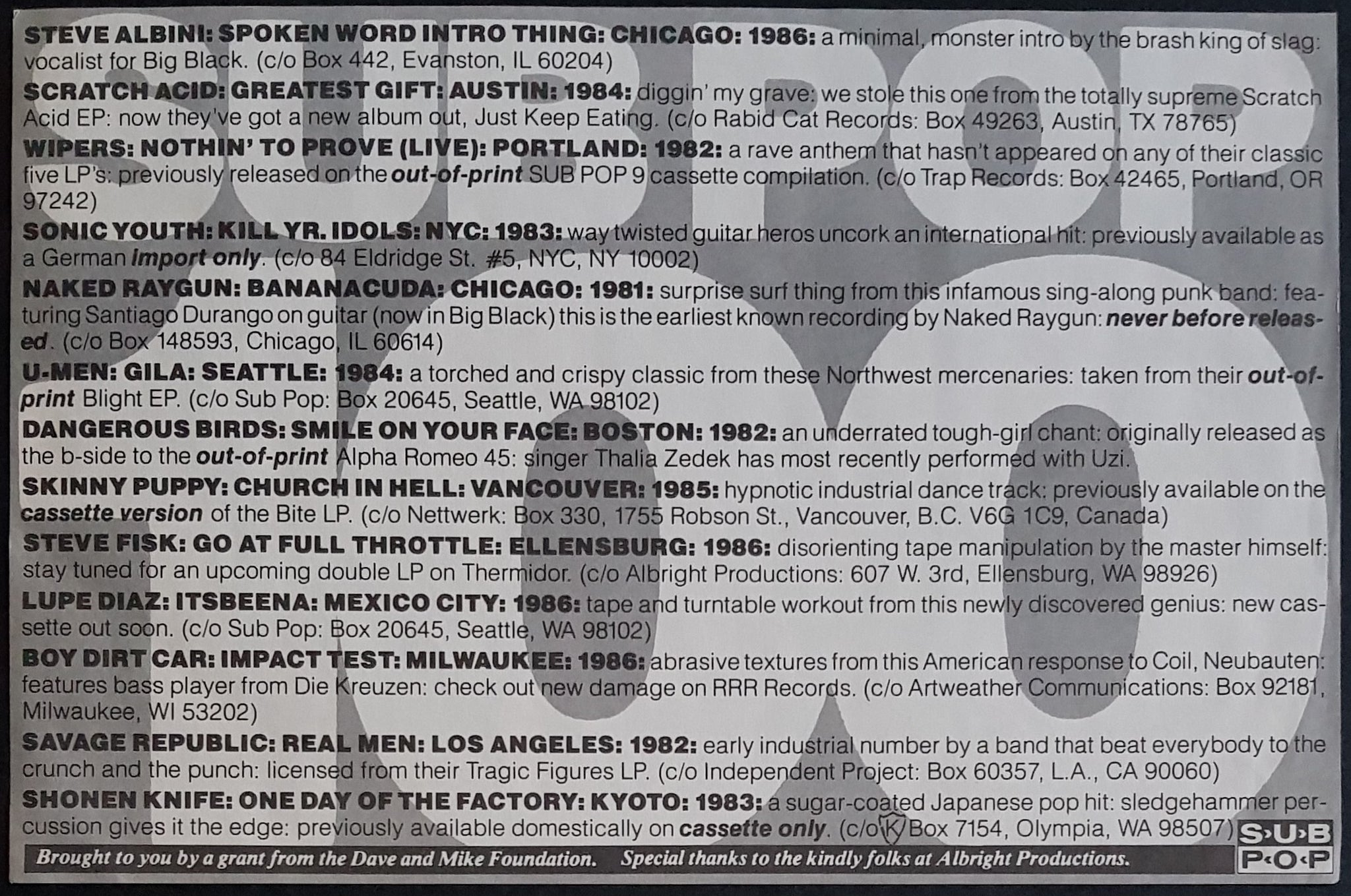 w.Insert. 1986 Sub Pop SP 10. Minor Creases on Cover. Features Steve Albini, Wipers, Sonic Youth, U-Men, Skinny Puppy ++++