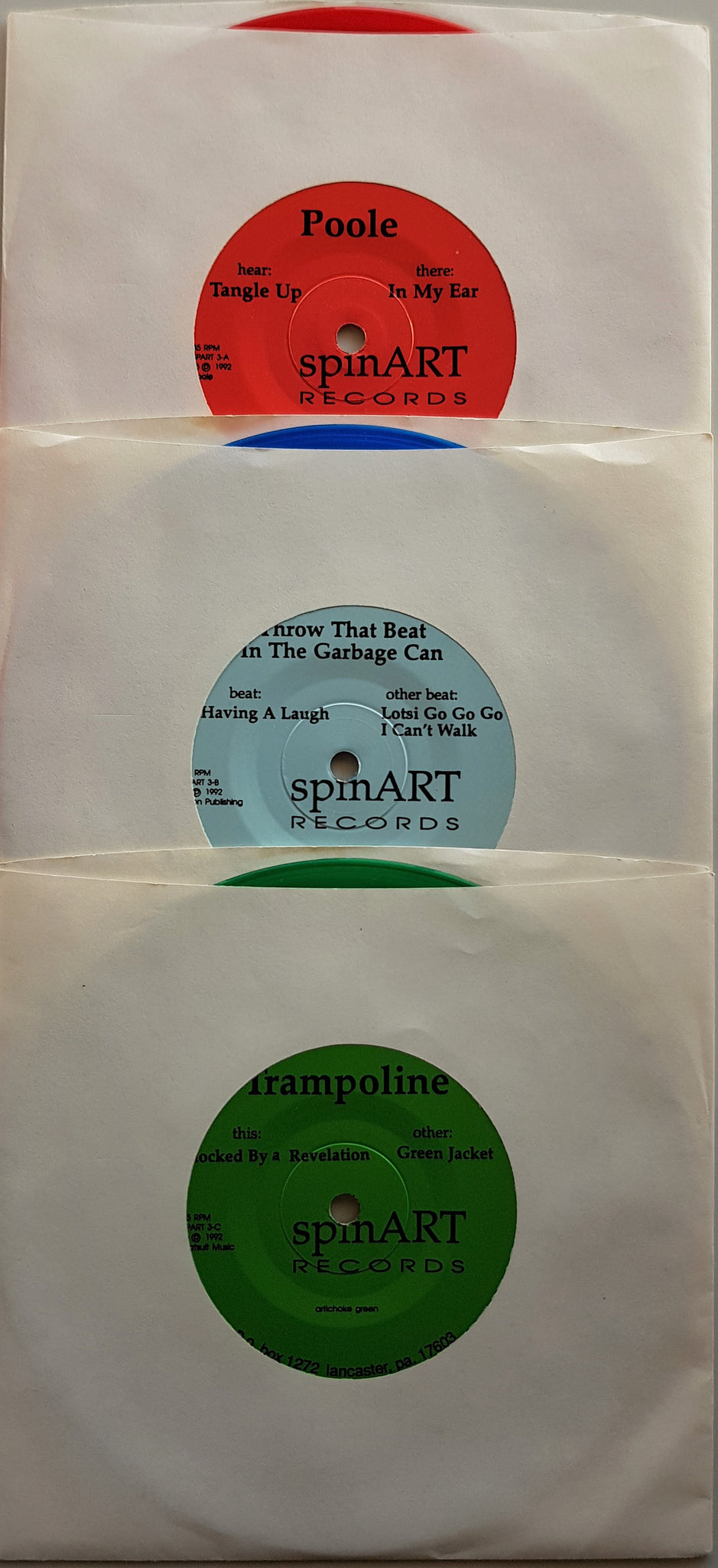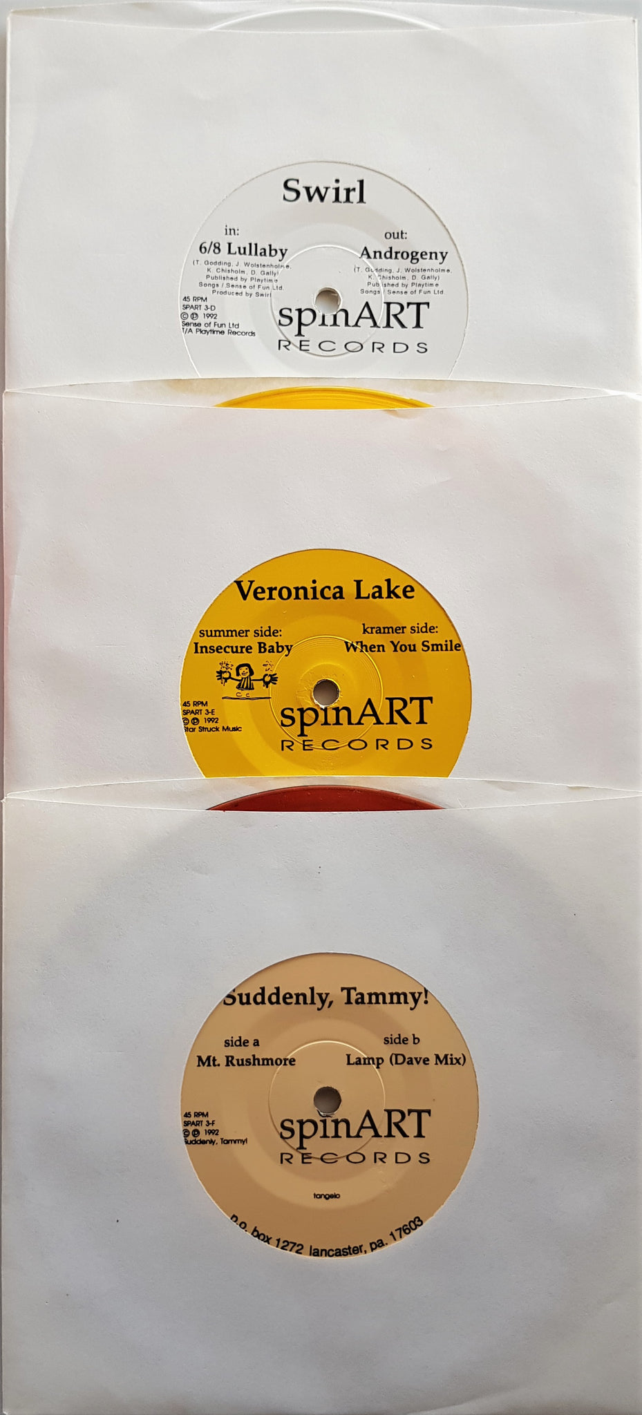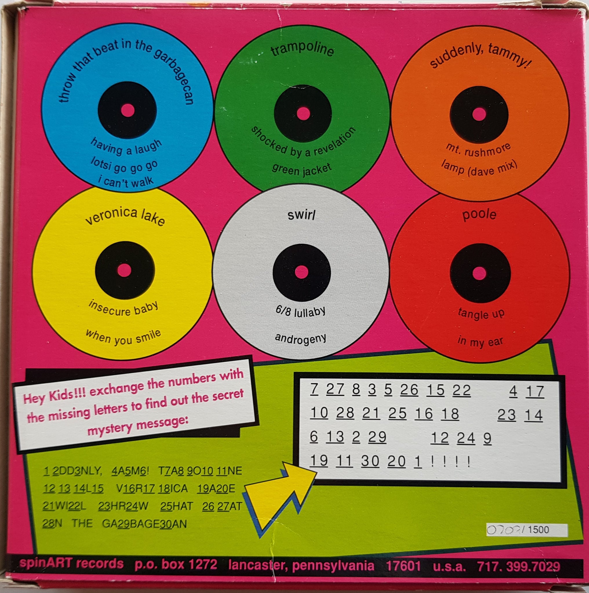 Box Set Of 6 Various Artists 45s all on Different Coloured Vinyl. 1992 spinART Records SPART3. 1500 Numbered Copies with Inserts, Stickers & Gimmicks. Other Artists Featured in this set are Veronica Lake, Throw That Beat In The Garbagecan, Swirl, Suddenly Tammy! & Trampoline. Box Has Faded along Edges