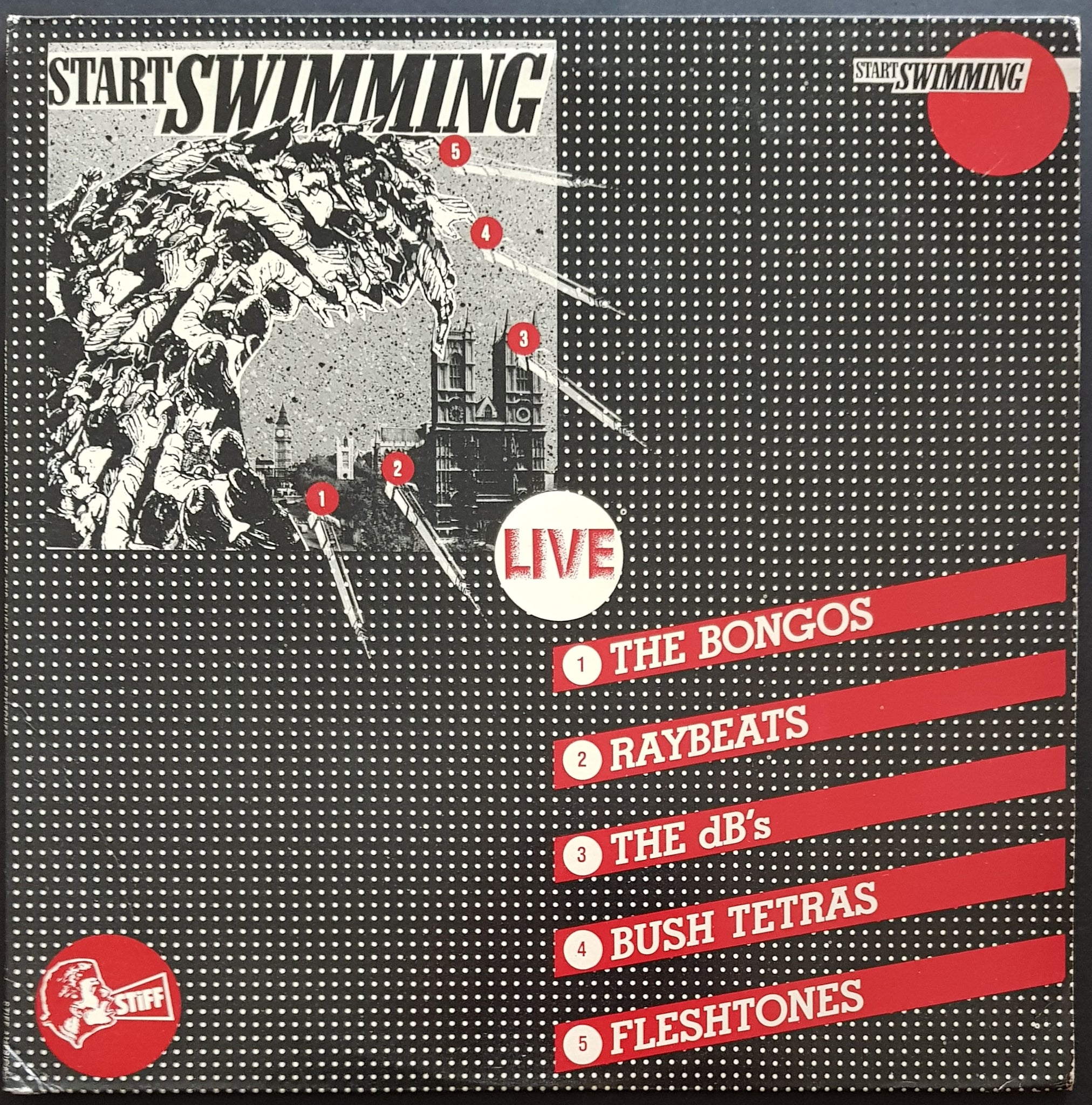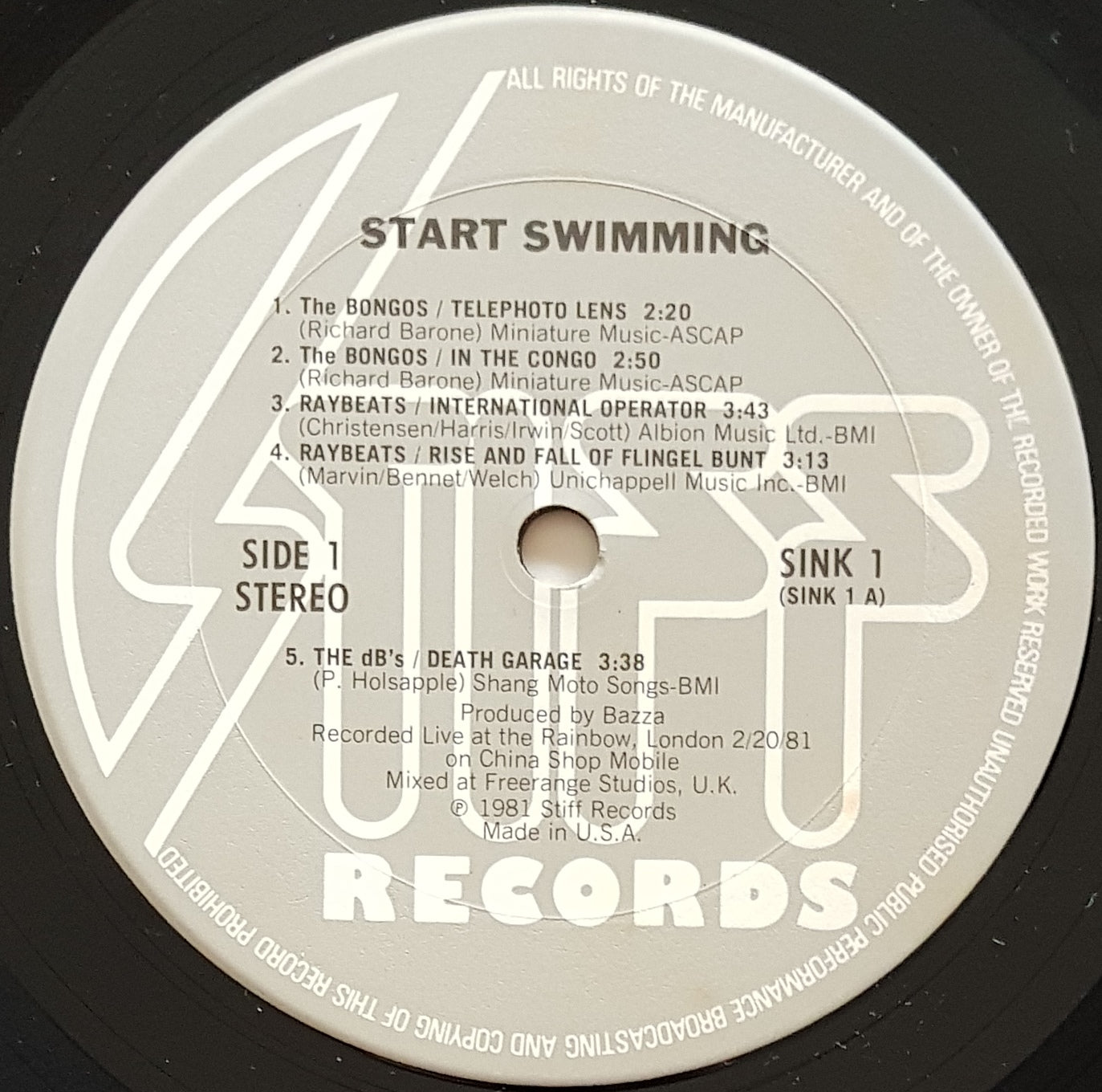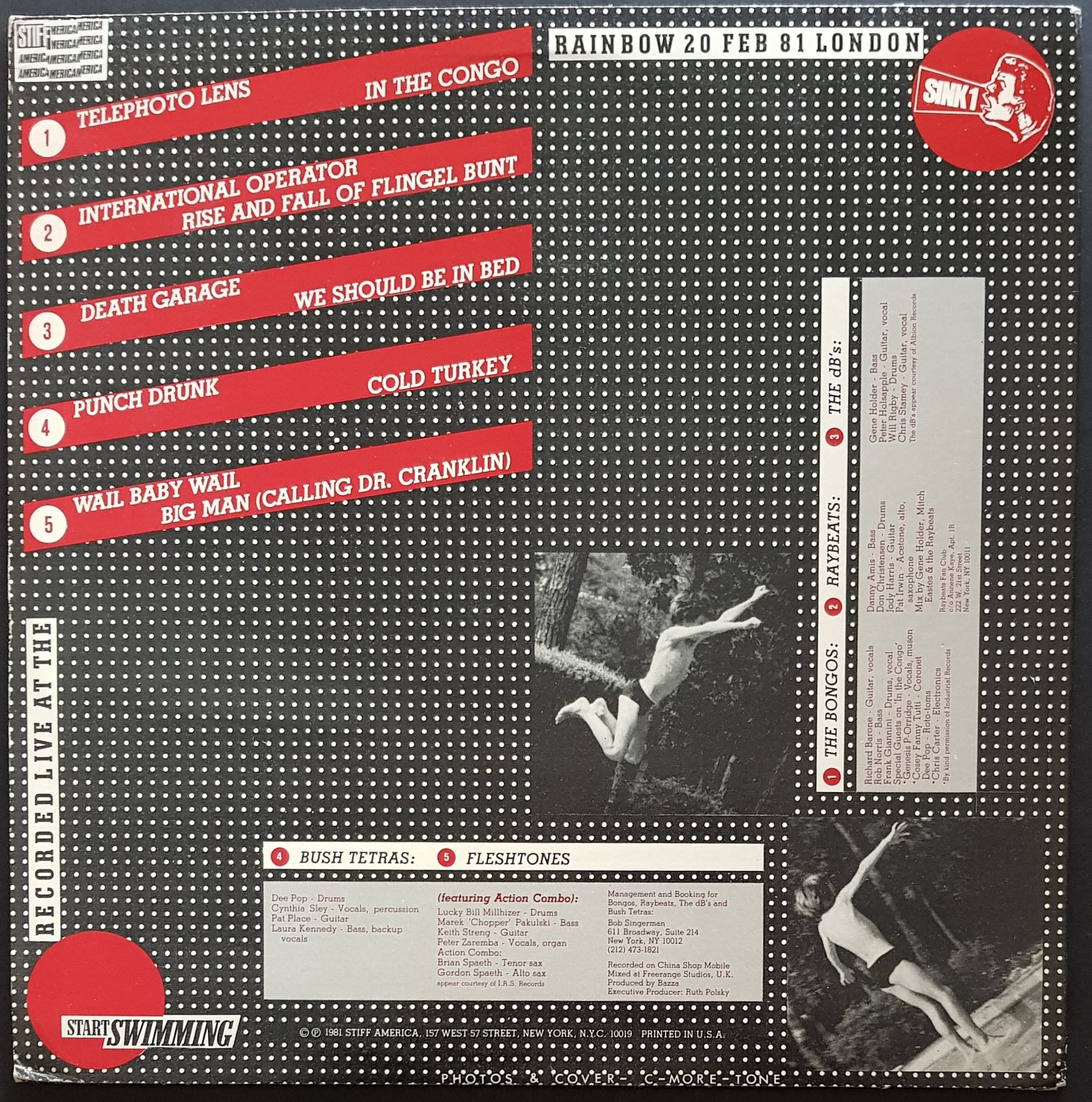 1981 Stiff America SINK 1. Recorded live at The Rainbow, London, 20th February 1981. Features 2 Tracks each by The Fleshtones, Bush Tetras, The dB's, The Bongos & Raybeats. Corner crease on cover. Minor foxing on labels.