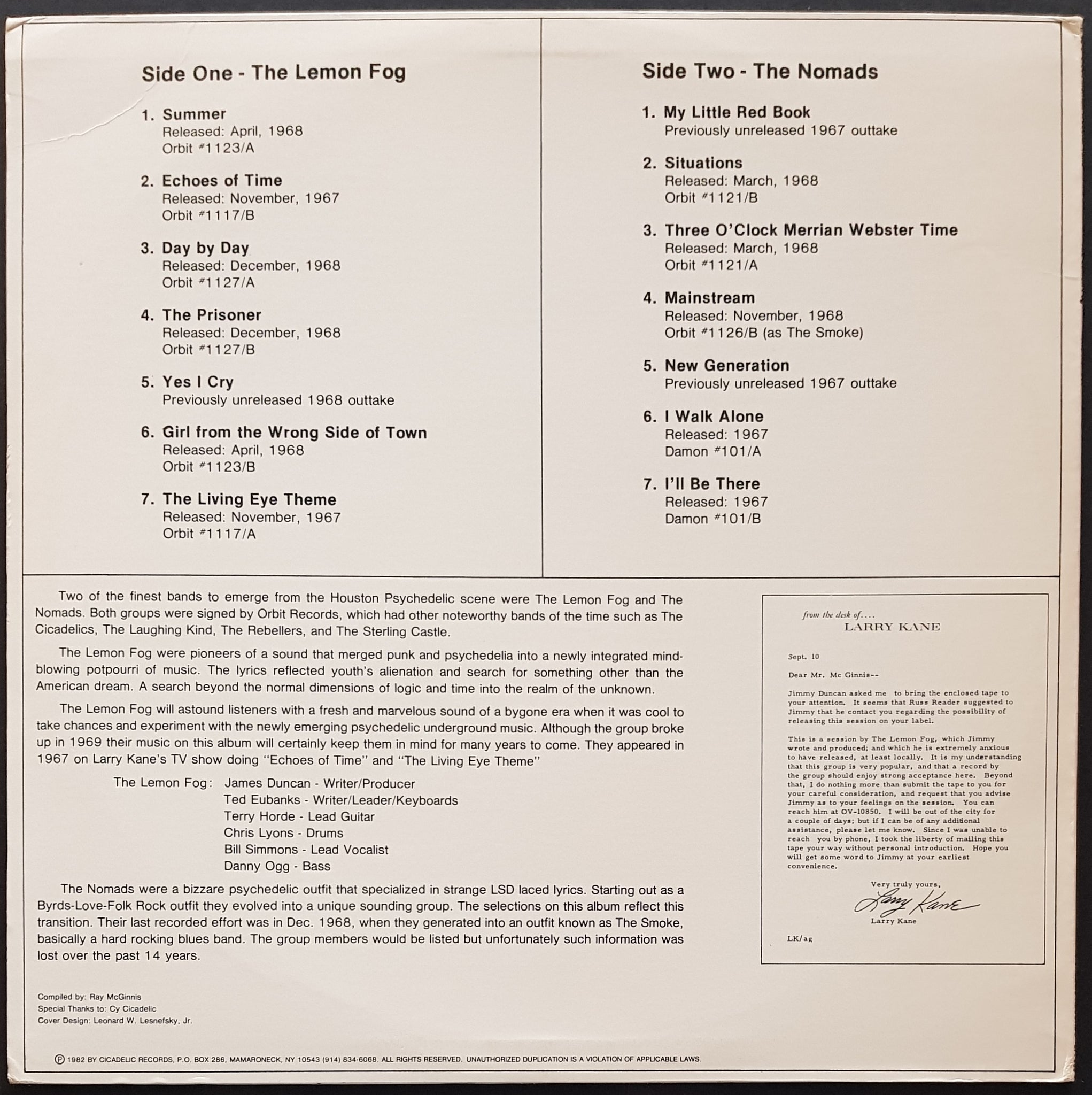 Split LP featuring 14 Psychedelic Sounds From The Lemon Fog & The Nomads. 1982 CICADELIC / ORBIT Records LP.999. 2 Corner Creases