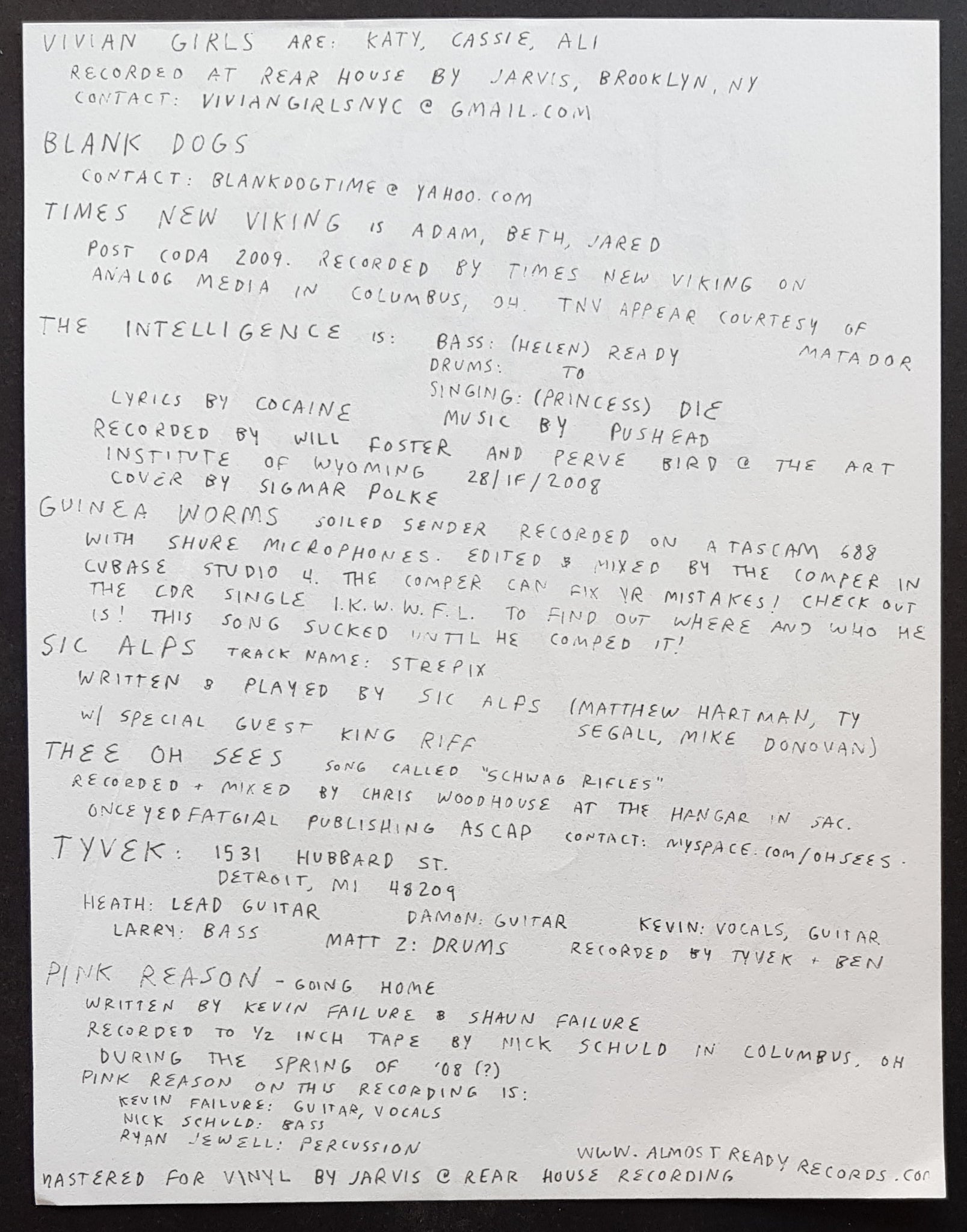 w.Insert. 2009 ALMOST READY Records ARR-012. Features tracks by Thee Oh Sees, Vivian Girls, Sic Alps and Others