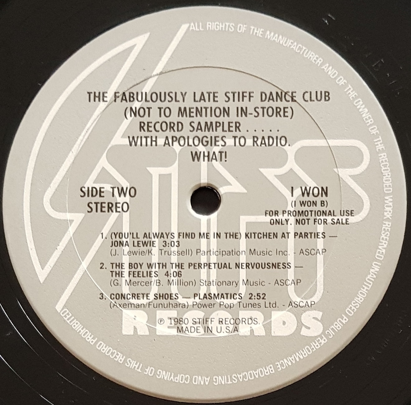Promo Only Sampler. 1980 Stiff Records 'I WON'. Die-Cut white sleeve with ink stamped title and Stiff America flag like sticker. Features Ian Dury, Any Trouble, Desmond Dekker, Jona Lewie, The Feelies & Plasmatics. Minor Foxing on Sleeve.