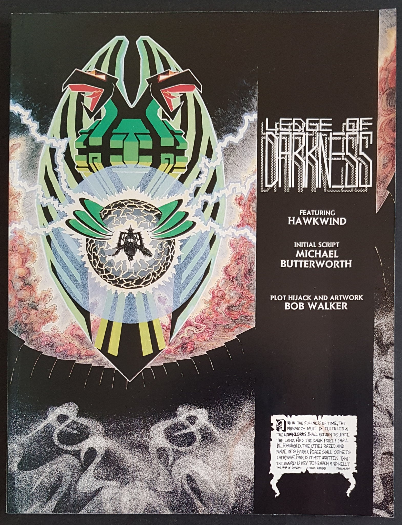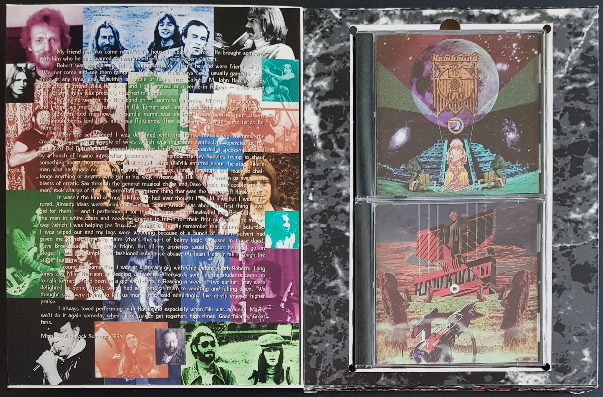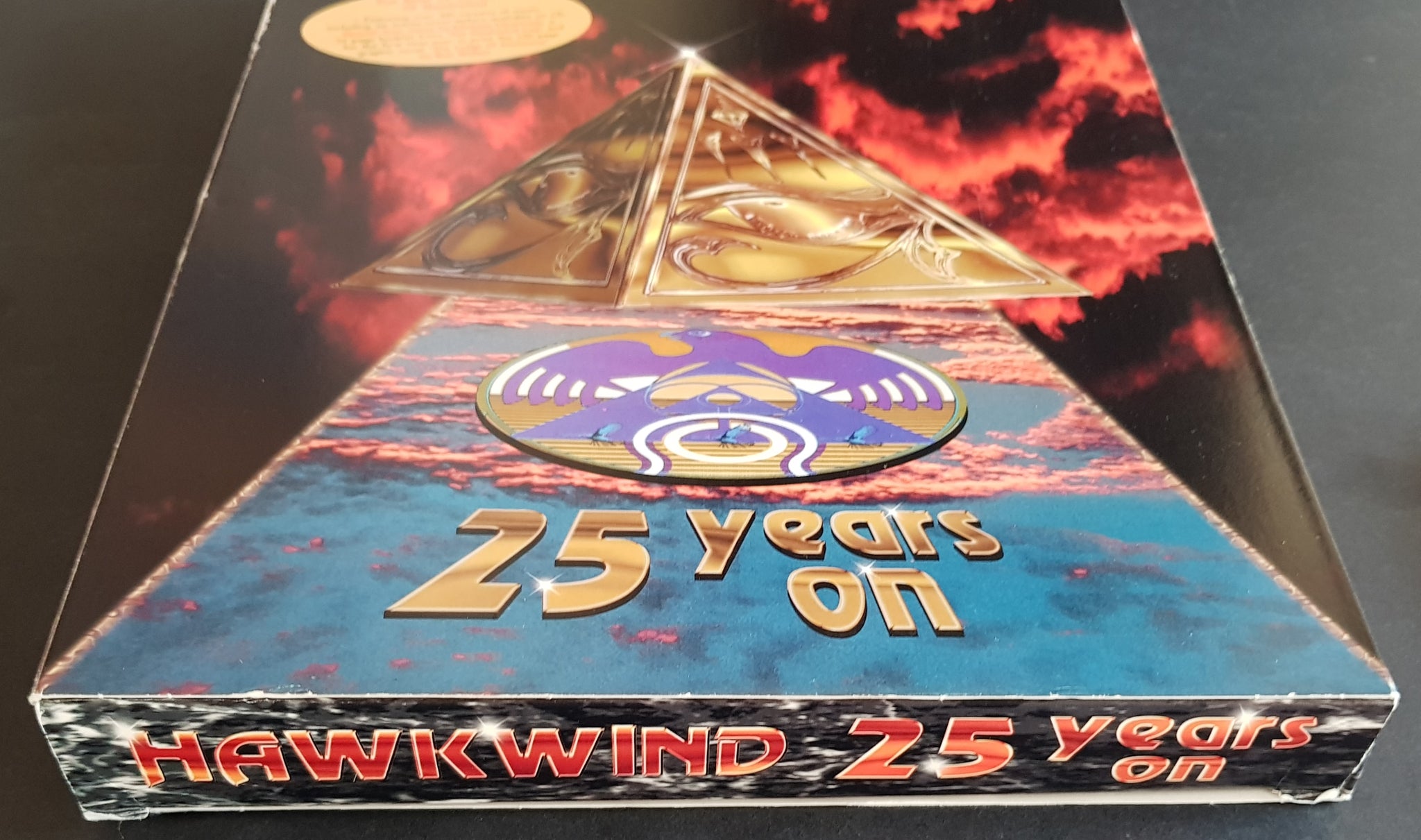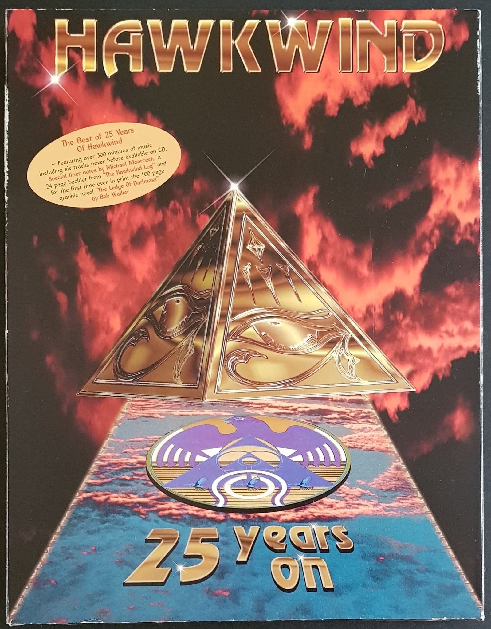 Box Set w.The Hawkwind Log" and 100 page graphic novel "The Ledge Of Darkness" by Bob Walker. 1994 Griffin Music GCD 299-0. 2 discs have minor scuffs. Box Cover has edge wear, storage indentations / marks, and crease on back due to weight of discs and poor storage. Coffee Cup Stain On Cover of 'Ledge'