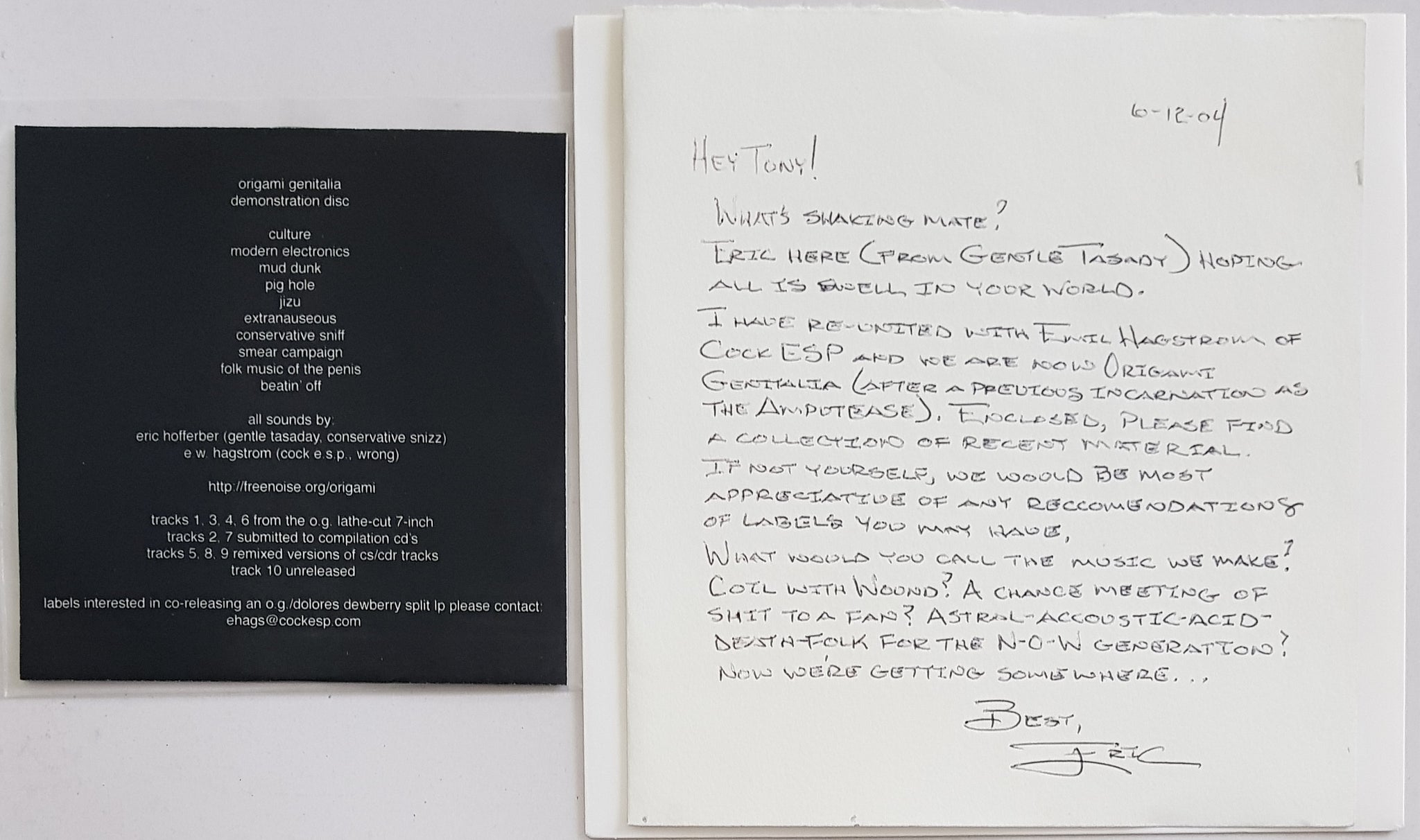 Lathe Cut Clear Vinyl. 2003 Sunship Records SUN36. Comes in a green die-cut, thick paper "filer" cover with all information typed in red letters, and band name and two "genitalias" stamped in black on one side of the cover. Limited edition of 41 copies (#26 / 41. with sticker, magnet, Comes with OG demo CD & personal letter from Eric Hofferber to Australian indie label manager