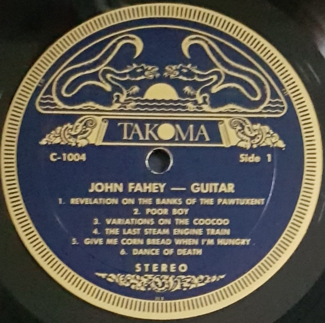 Takoma C-1004. Cover is from 1974. Record appears to be an earlier issue w. Blue & Gold label design? Cover has foxing on rear, minor ring wear on front and has partial fade line along top seam and spine