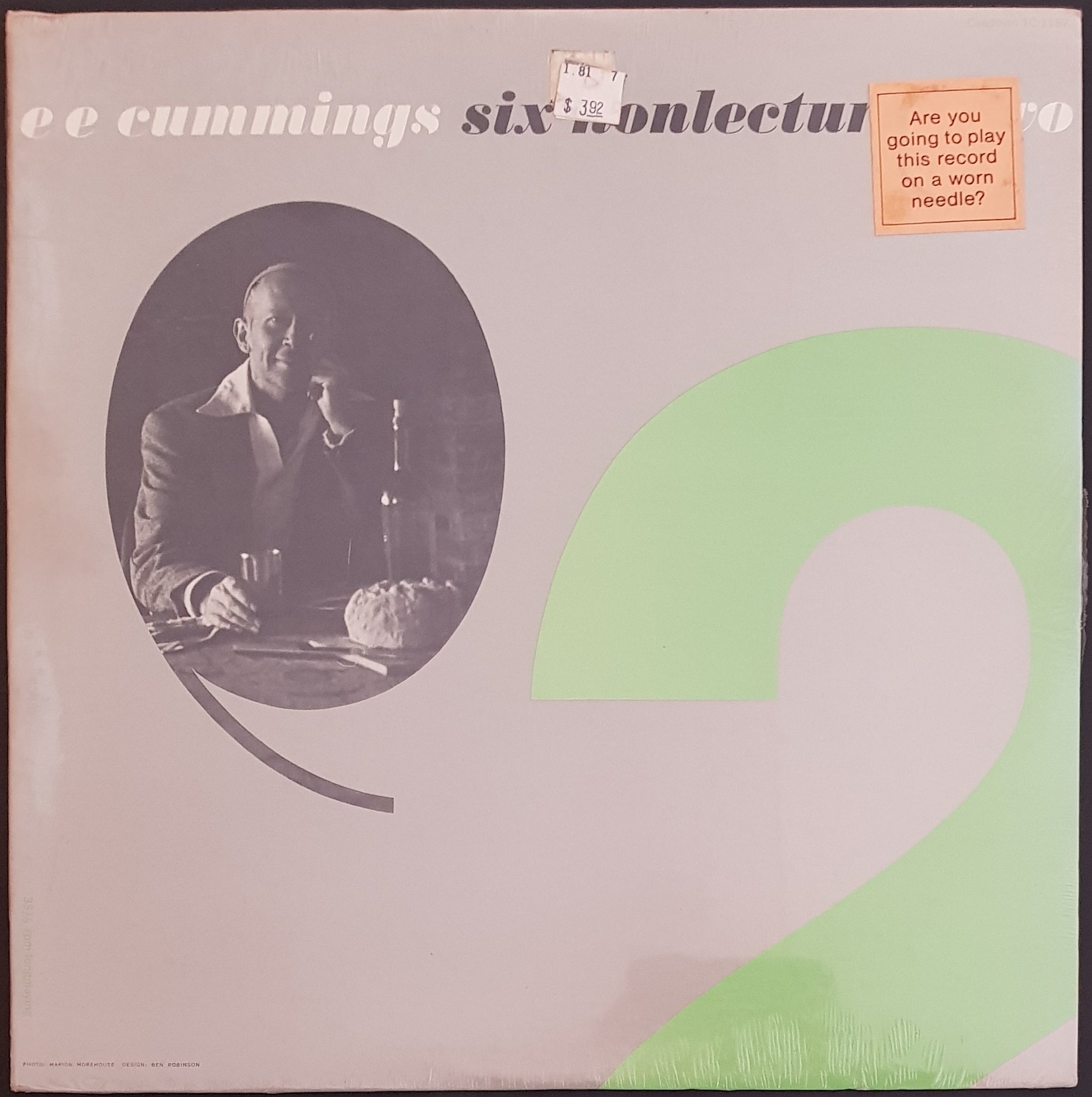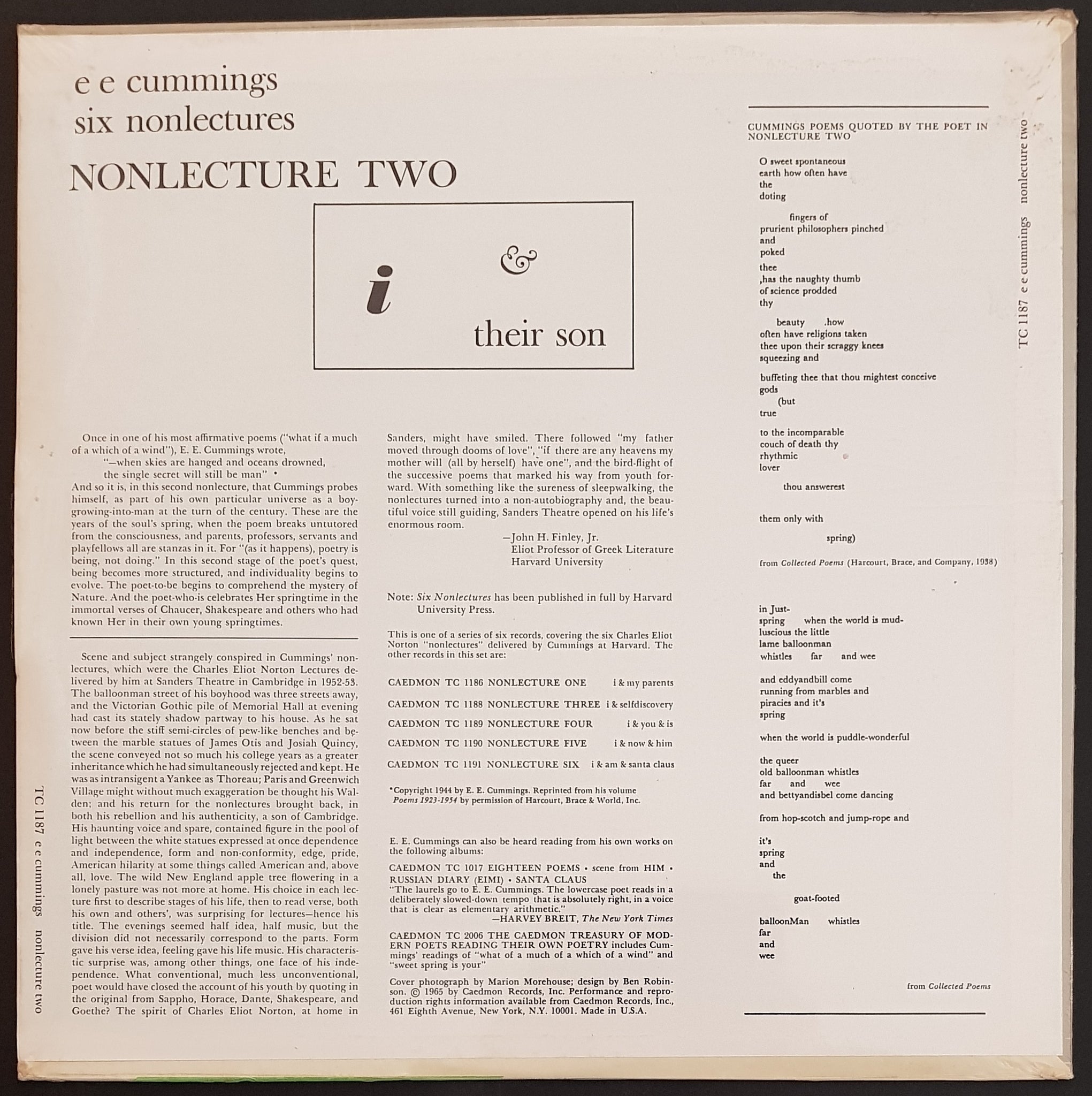 1965 Caedmon Records TC 1187. This is one of a series of six records, covering the six Charles Eliot Norton "nonlectures" delivered by Cummings at Harvard. Cover has slightly turned corners. Old Shop Stock. SEALED COPY.