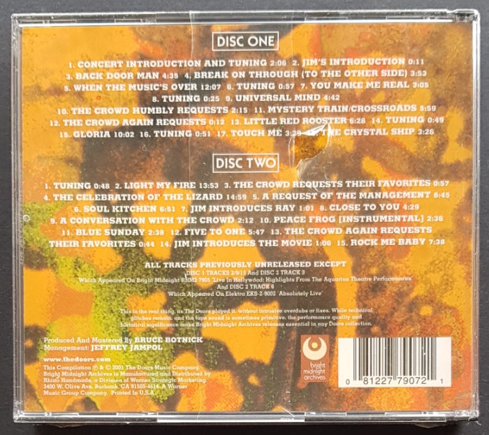 2001 Bright Midnight Records RHM2 7907. Recorded July 21, 1969 at The Aquarius Theatre in Hollywood, California, USA. (Late Show). Credits Management to Jeffrey Jampol instead of Danny Sugarman on the back. Misprint - on front cover states "The First Performance" in silver ink but all the rest of the markings are for the second performance.