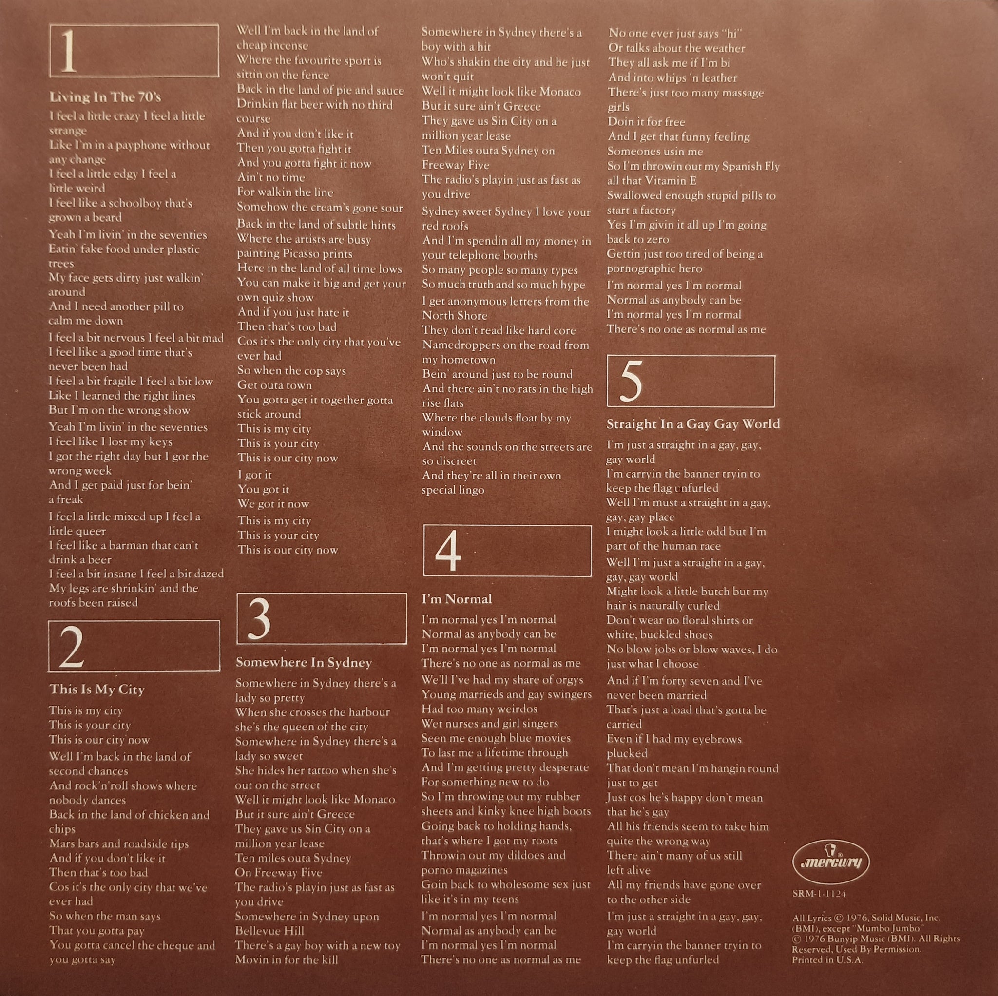w.Insert. 1977 Mercury SRM-1-1124. This album is effectively "Straight In A Gay Gay World" with "This Girl Says She's Bored" replaced with "Living in the 70's". Cover has original shrink wrap. Deletion corner cut and surface scratch on front cover. Record is very clean