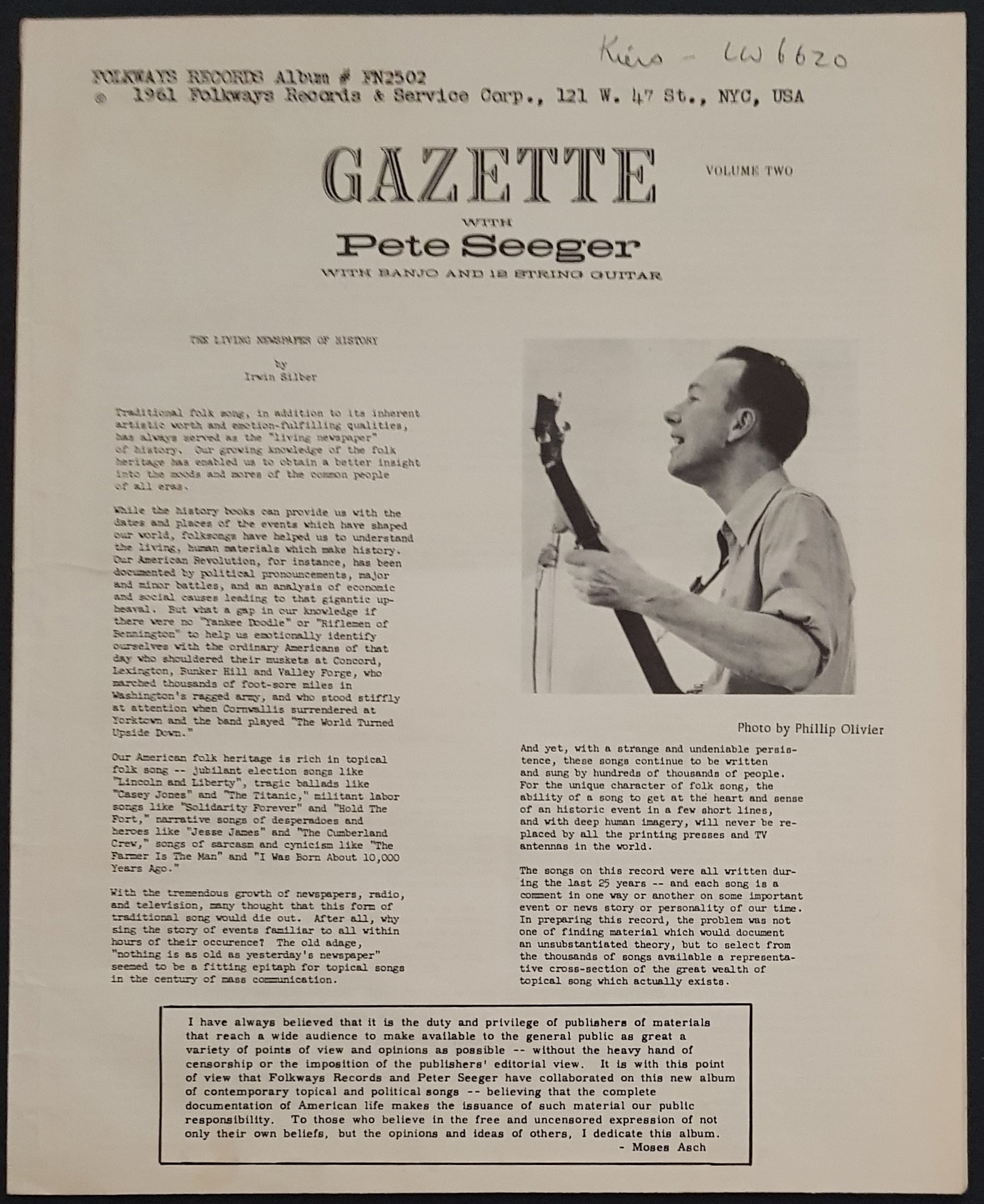 w.Booklet (has small writing on front). 1961 Folkways Records FN 2502.