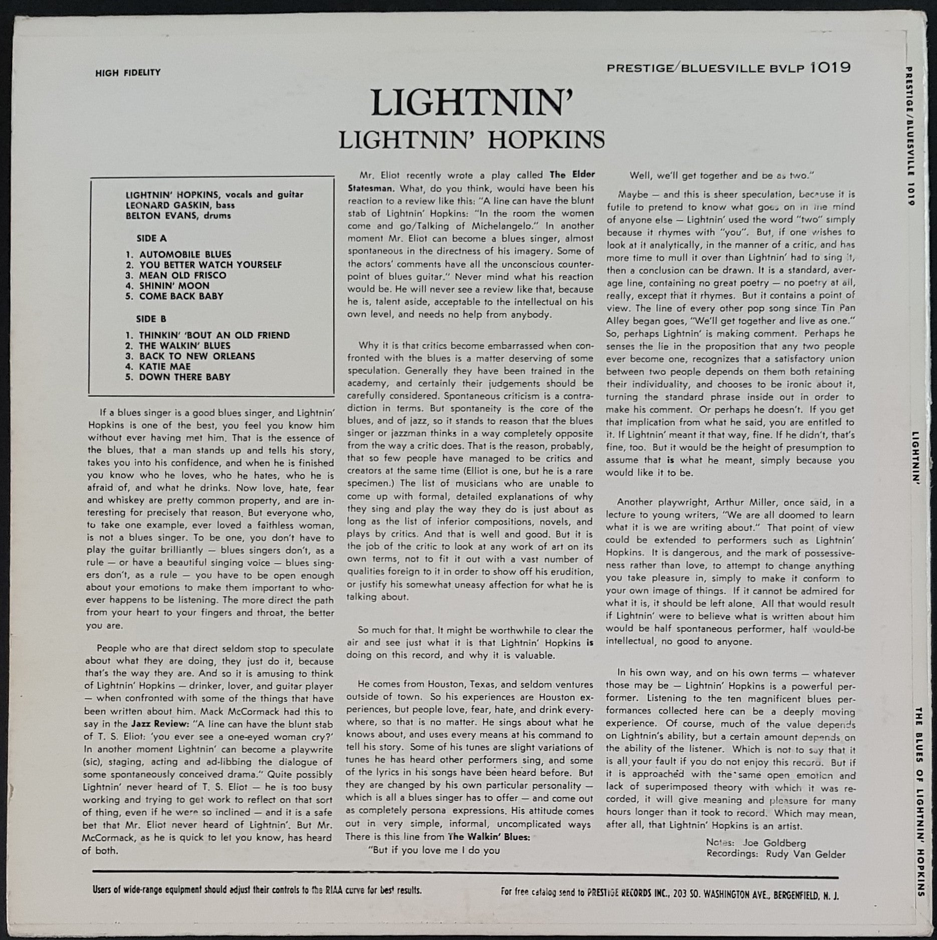 1964 MONO Prestige PRLP 1019. Minor wear and heavier creases on cover, with small spine split. Light hairlines and a couple of fine marks that will sound